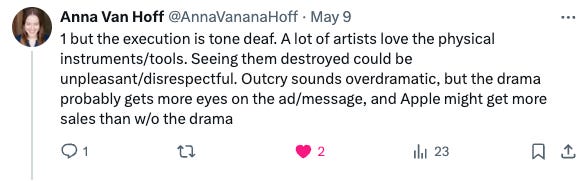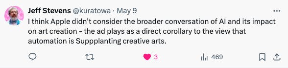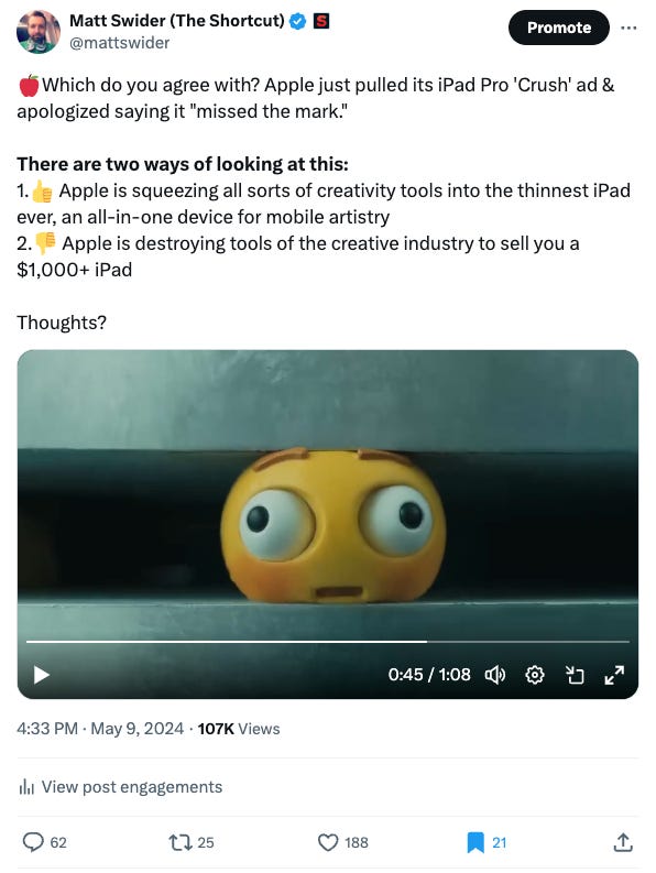 Also, 107,000 of you read through the reactions on my X post regarding Apple’s controversial “crushing” ad. The responses? Surprisingly mixed in Story #2.