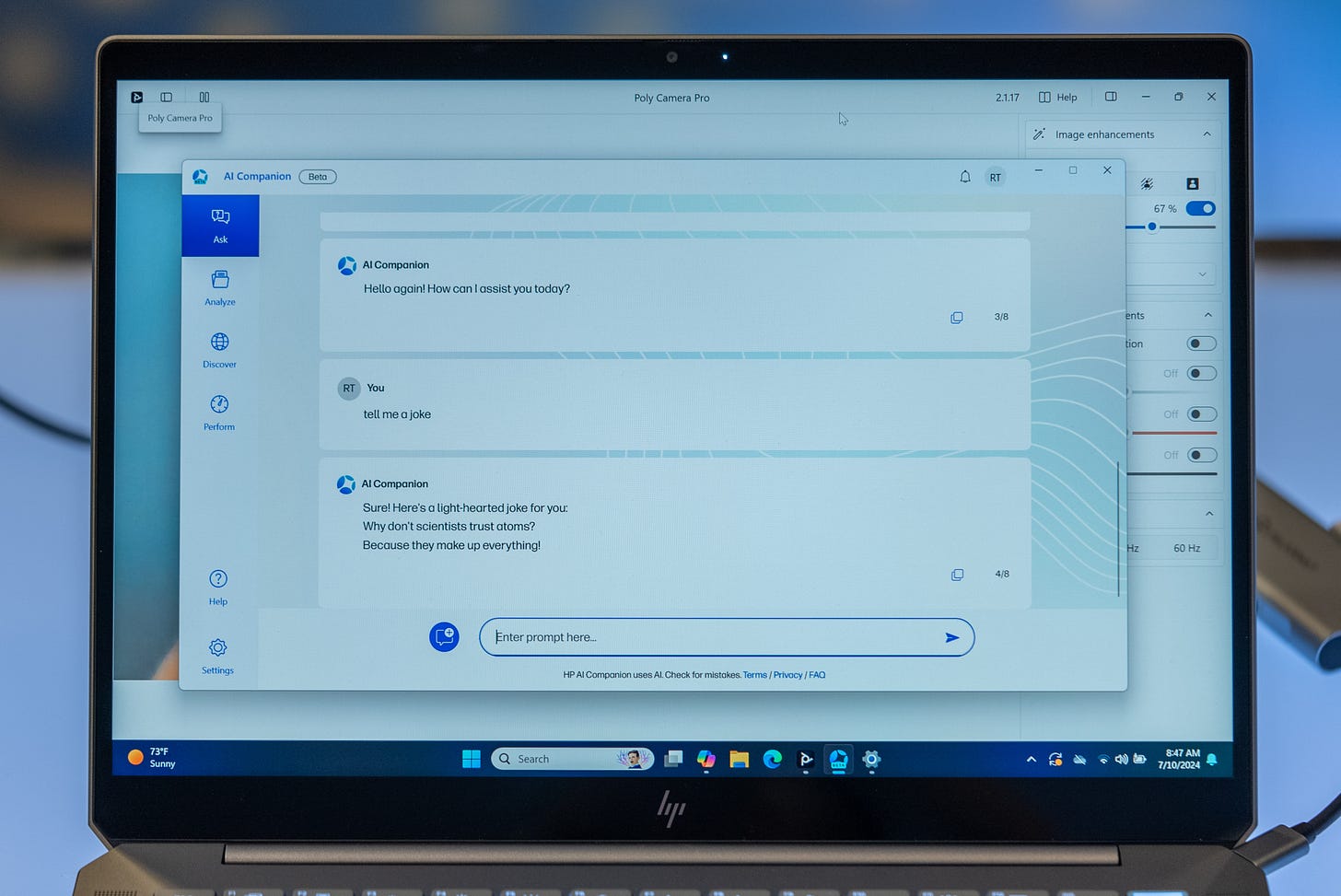 🤖 AI Companion. All of the OmniBook Ultra’s AI processing power is put to good use with HP’s new AI Companion. The app is still in an early beta state, but you can use it to optimize your PC settings, analyze and generate text, ask it questions, or tell jokes and short stories. During my hands-on, the AI Companion was fairly accurate with its answers and quick to respond to anything I asked it. My only concern is how redundant might the AI Companion be when Windows 11’s built-in CoPilot can perform similar tasks.