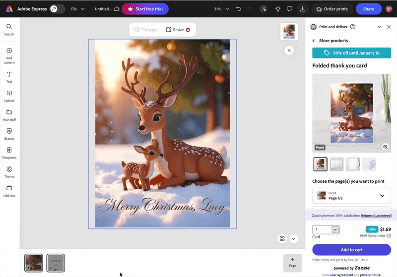 One of the biggest perks of using Adobe Firefly for creating your holiday card is the ability to take it right into Adobe Express to finish the job. If you aren’t familiar, Express is Adobe’s free and easy way to create social media posts, flyers, cards, and more in a pinch with high-quality graphics, text tools, and effects. We’ve used it before to create a Mother’s Day Card.