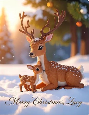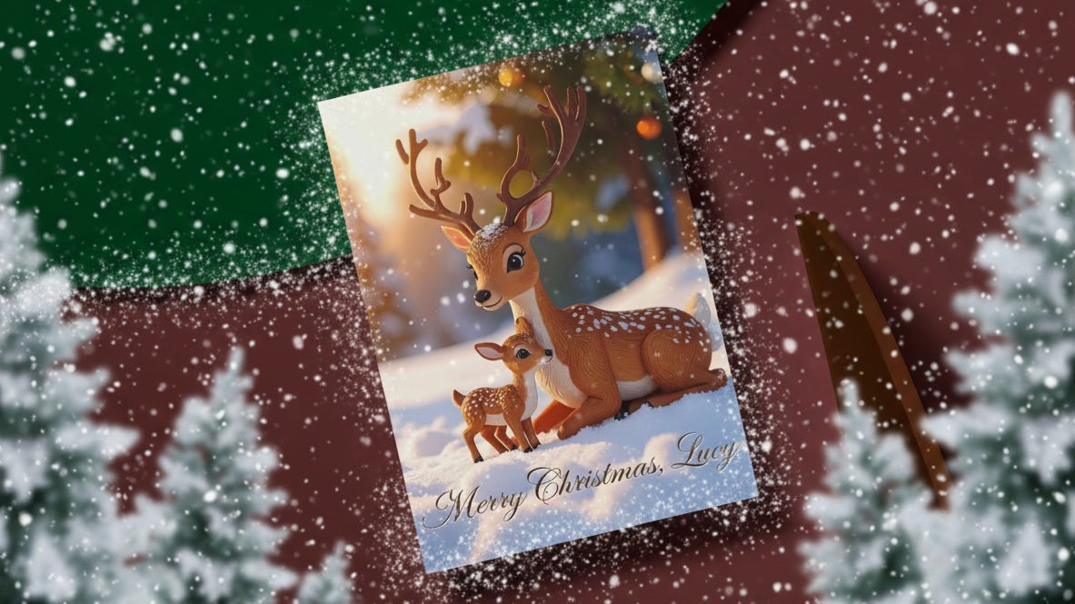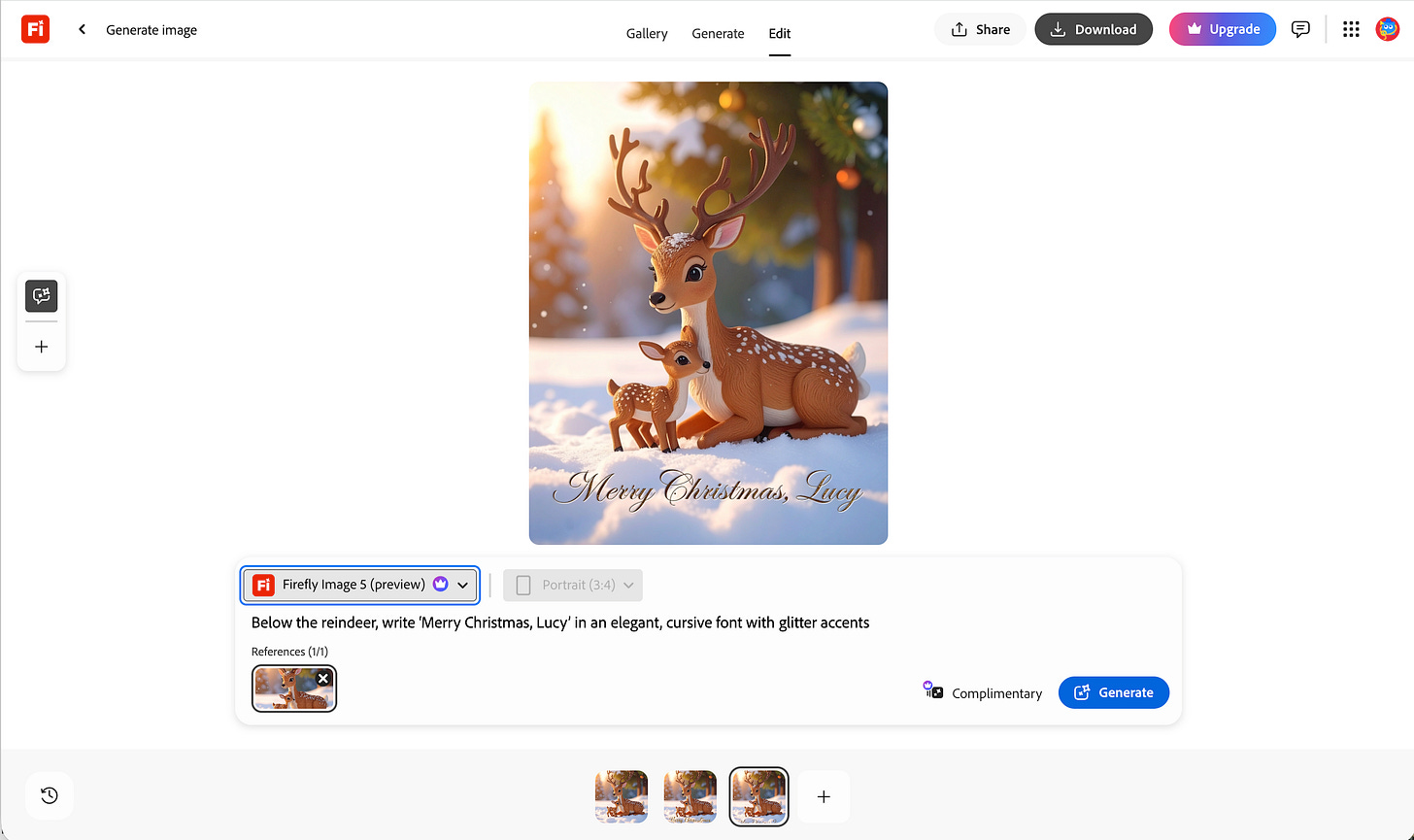 I typed into the prompt box: “Below the reindeer, write ‘Merry Christmas, Lucy’ in an elegant, cursive font with glitter accents.”