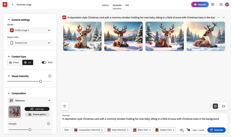 You can choose different effects, lighting, and color tones for your image, too, which Firefly can incorporate into your design. I’m a fan of warm lighting at golden hour over a field of snow, so I chose those settings before I re-generated my image. With my claymation references loaded, I hit the blue “Generate” button again to refine my image.