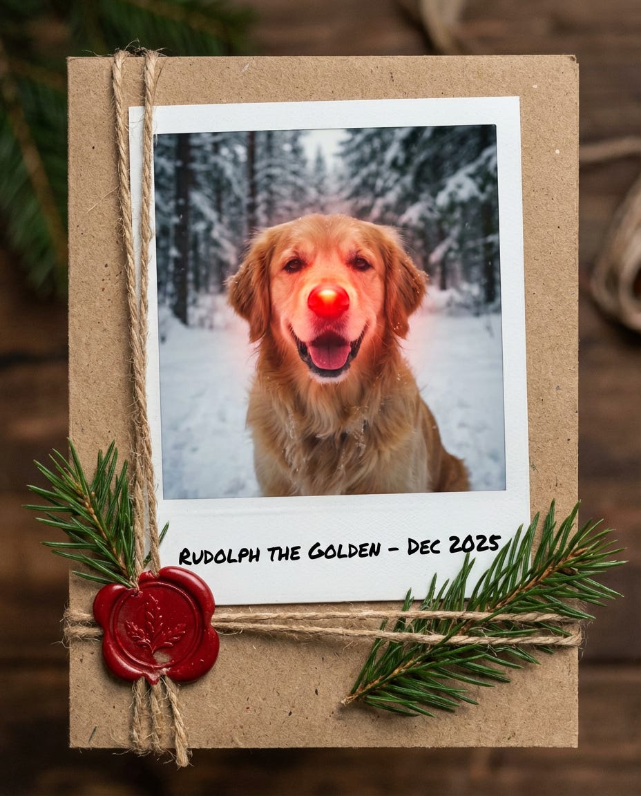 A festive Christmas card with a Polaroid photo of a golden retriever wearing a fake, glowing red nose.