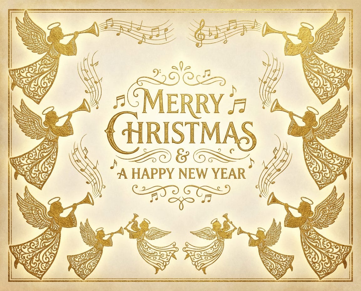An elegant Christmas card with golden angels around the border. Have the angels playing trumpets with musical notes flowing through the ends of the instruments.