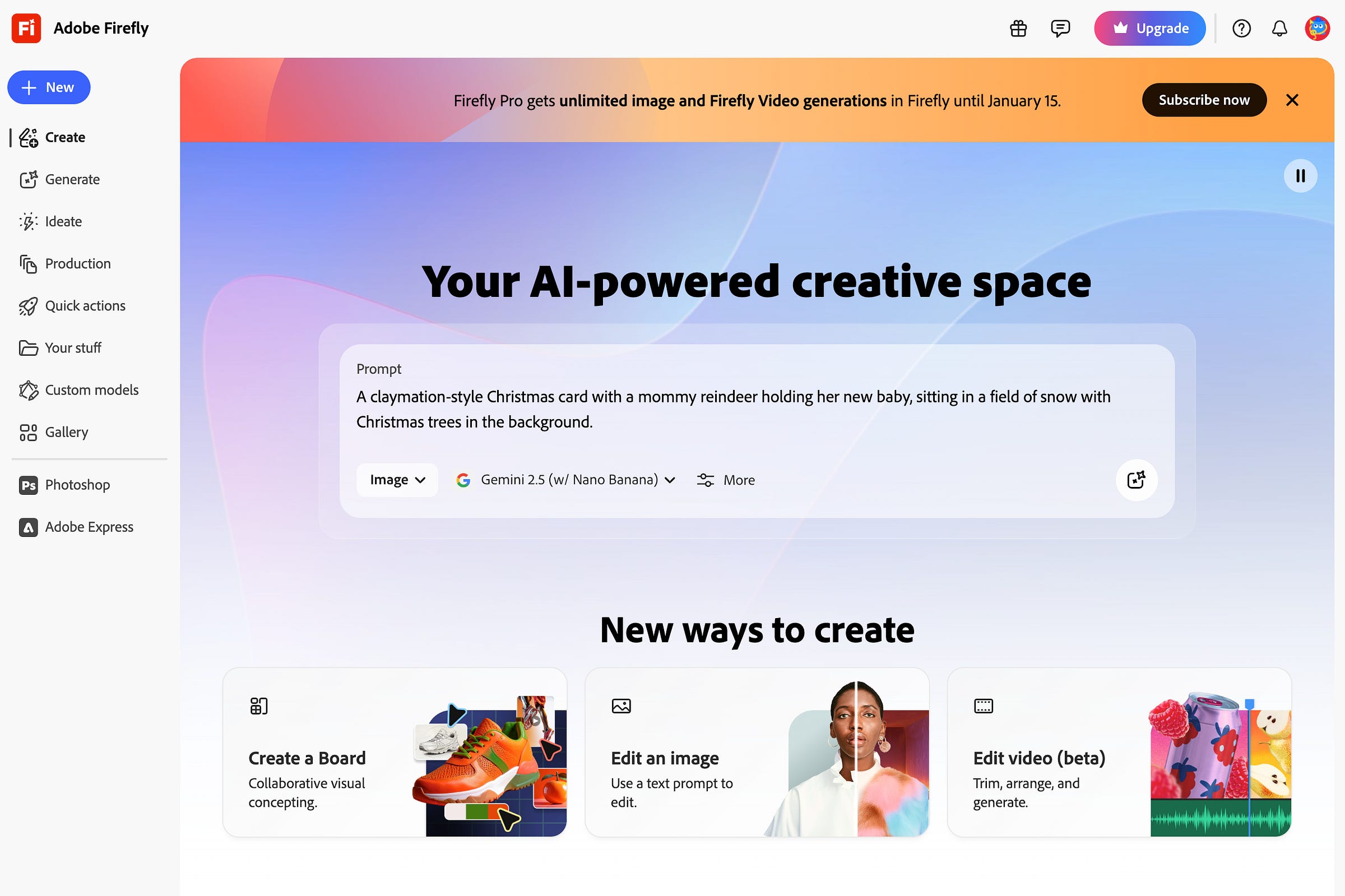 That’s where I’ve enlisted Adobe Firefly into my holiday tradition. The company’s all-in-one AI creative studio helped me create a card using simple text prompts. The best part? You can start generating images in Firefly for free or start a 7-day free trial to a paid plan. If you have cardstock handy, that’ll make the whole process even quicker.