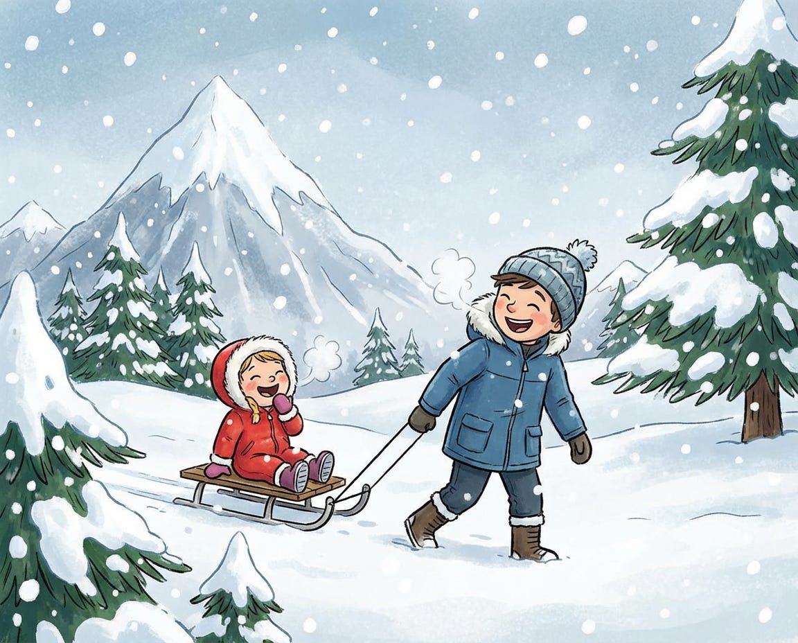 A snowy mountain top with snow falling amongst the trees. Include an older brother and little sister. Make it look like a cartoon.