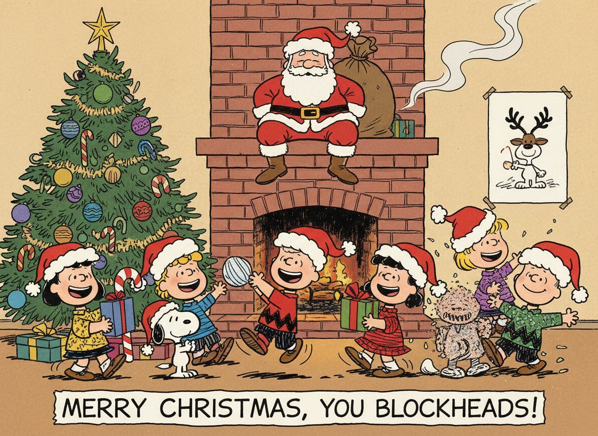 A holiday party in the style of classic Peanuts cartoons. Include a bunch of kids enjoying festive games and wearing Santa hats, with Santa Claus coming down the chimney in the background.