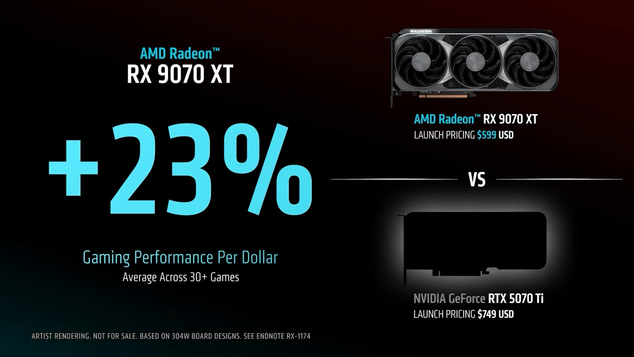 08:29 ET: Bullish claims from AMD now. They’re comparing it against the recently released RTX 5070 Ti. The RX 9070 XT delivers 23% better gaming performance per dollar.