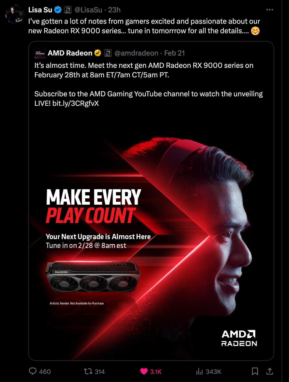 07:20 ET: We’re less than an hour away from AMD’s RX 9000 Series reveal, but will we be pleasantly surprised or bitterly disappointed? AMD CEO Dr. Lisa Su hinted on X that she’s been listening to what gamers are saying, though we’ll have to wait and see. Not long to go now.