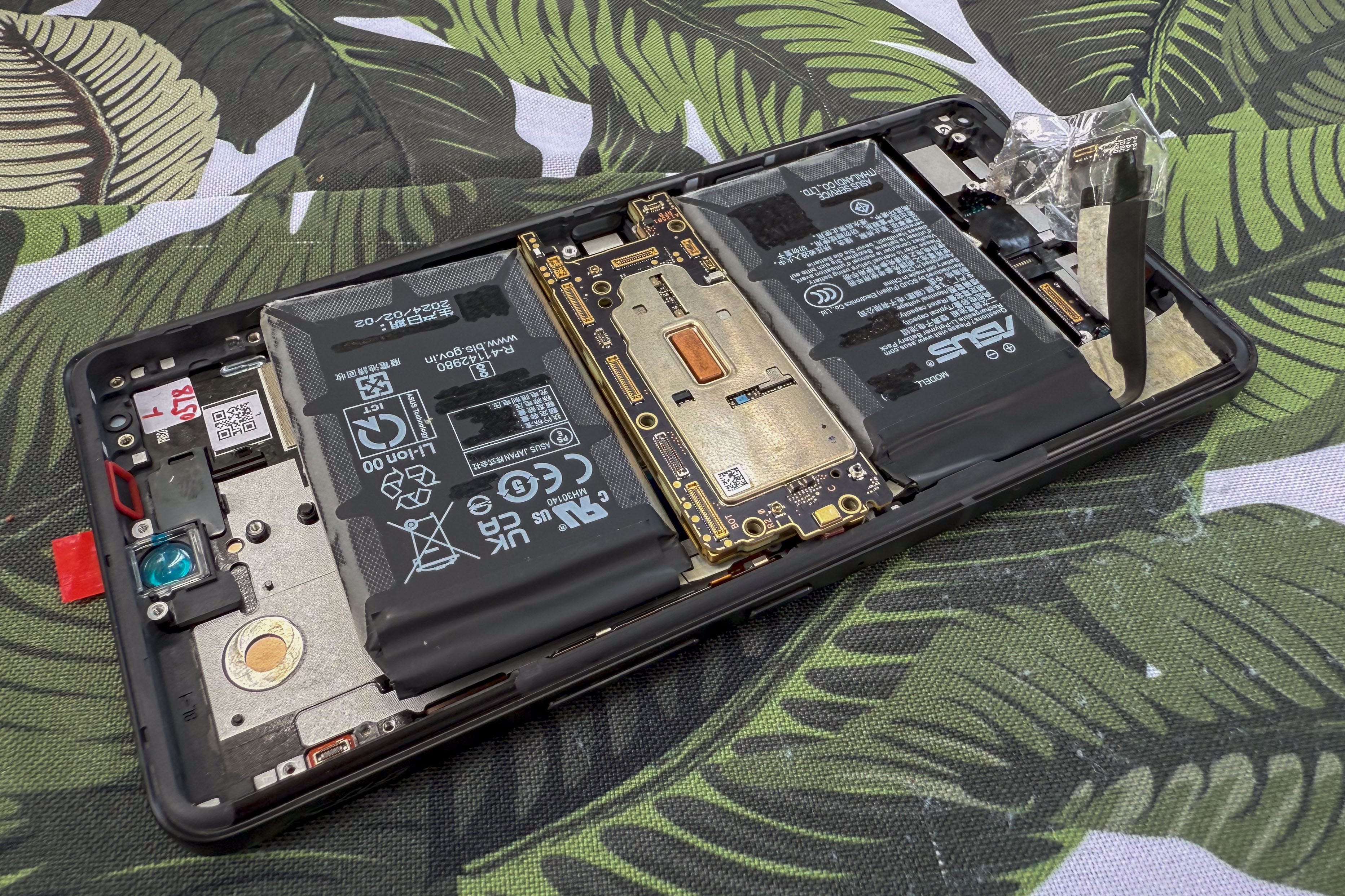 One thing that Asus takes pride in is its small motherboard and split battery design, which offer both faster charging and heat dispensation benefits. The motherboard for the ROG Phone 9 fits into the middle, flanked by the dual battery configuration.