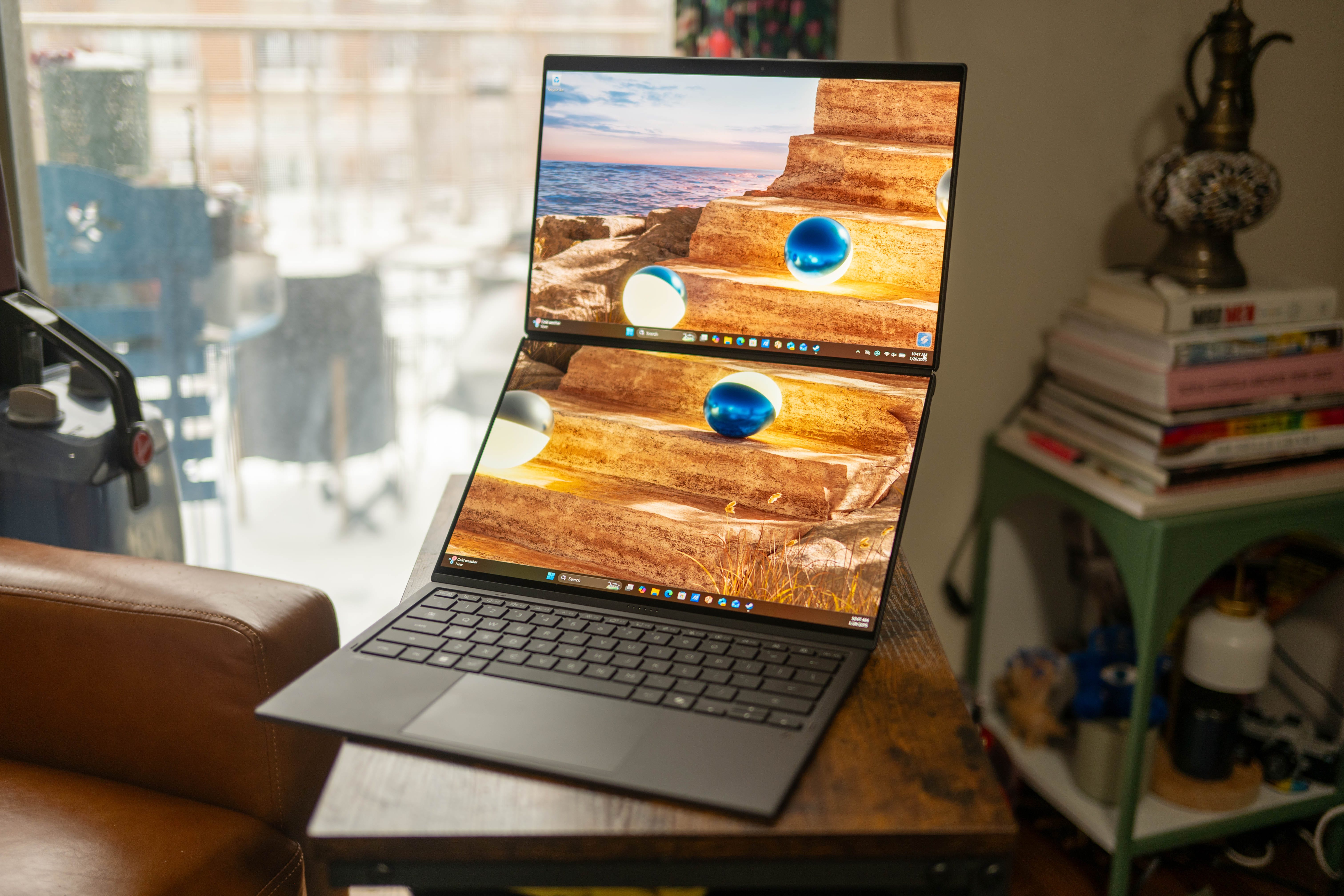 🧑🤝🧑 Double the screen, double the fun. The Asus ZenBook Duo looks like any other notebook, albeit with a thicc bottom section, but yank the keyboard away, and you’ll reveal a second screen. Thanks to the integrated kickstand on the back of the laptop, you can use those two 14-inch screens standing upright on top of each other or side-by-side in a portrait orientation. The displays even play a fun falling marbles animation as you rotate the device. Both screens offer the same 3K resolution (2,880 x 1,800), 144Hz refresh rate, and 1000-nit HDR peak brightness – so you’ll get the same picture from either display.
