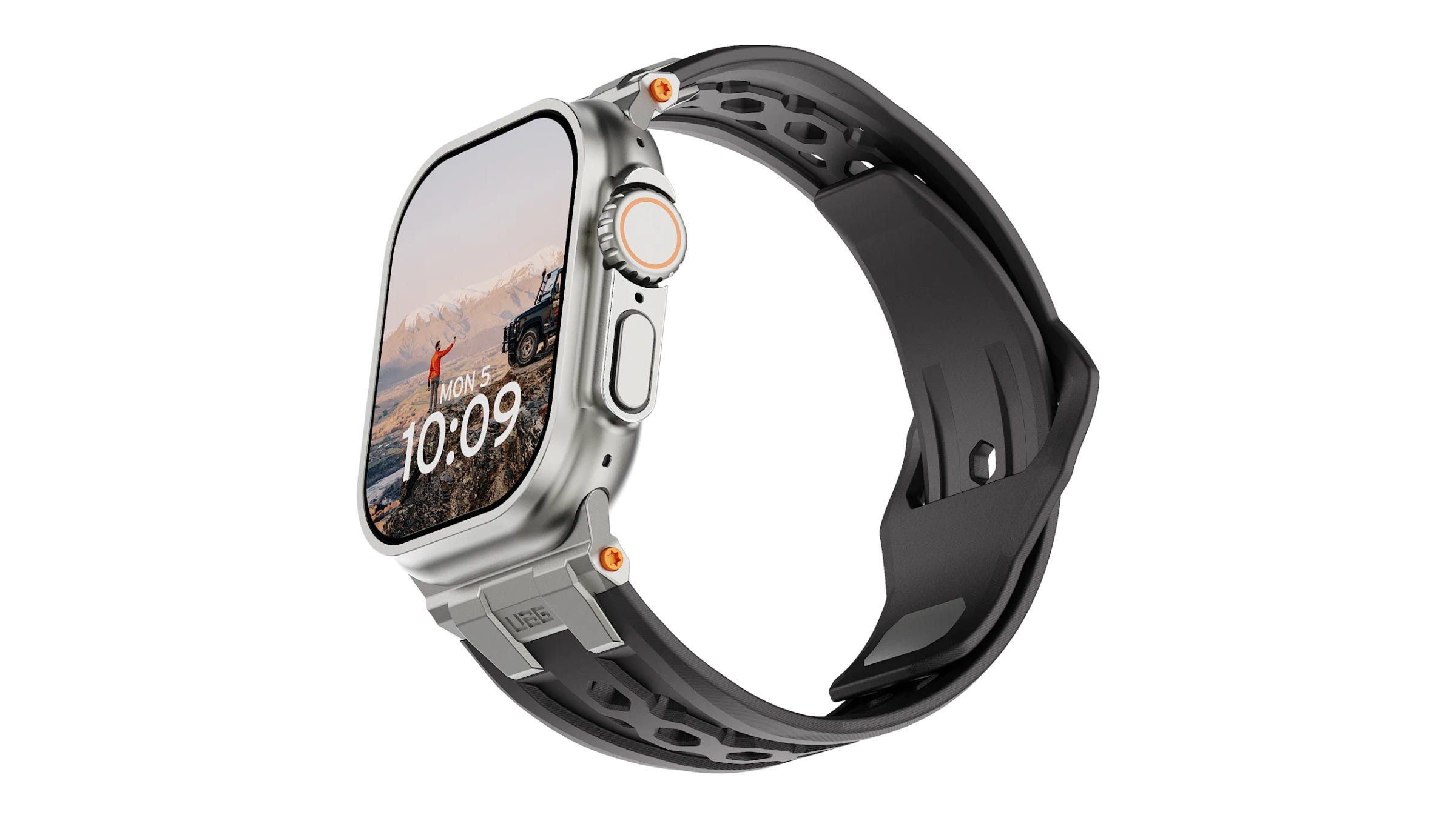 UAGās Monarch Strap for the Apple Watch Ultra 3 has a unique design. Stainless steel lugs adorn the FKM straps to elevate the rugged, bulky appearance of the Ultra and give it an even stronger presence on the wrist. The tuck-and-pin closure means it wonāt be going anywhere no matter what adventure you embark on, and it remains breathable with its hexagonal ventilation. Itās available in four different colors, all of which come with titanium-colored stainless steel.