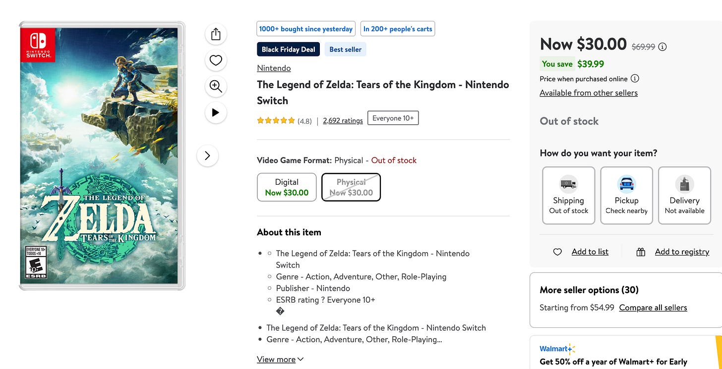 The Legend of Zelda: Tears of the Kingdom - $30 (was $69)
