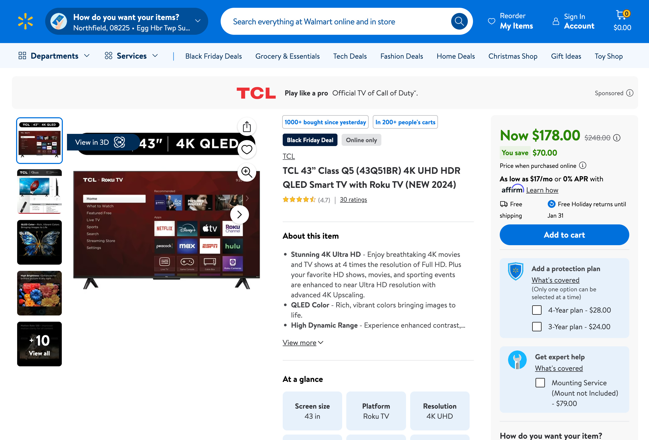 Walmart: TCL 43-inch Class Q5 4K UHD HDR QLED Smart TV - $178 (was $248)