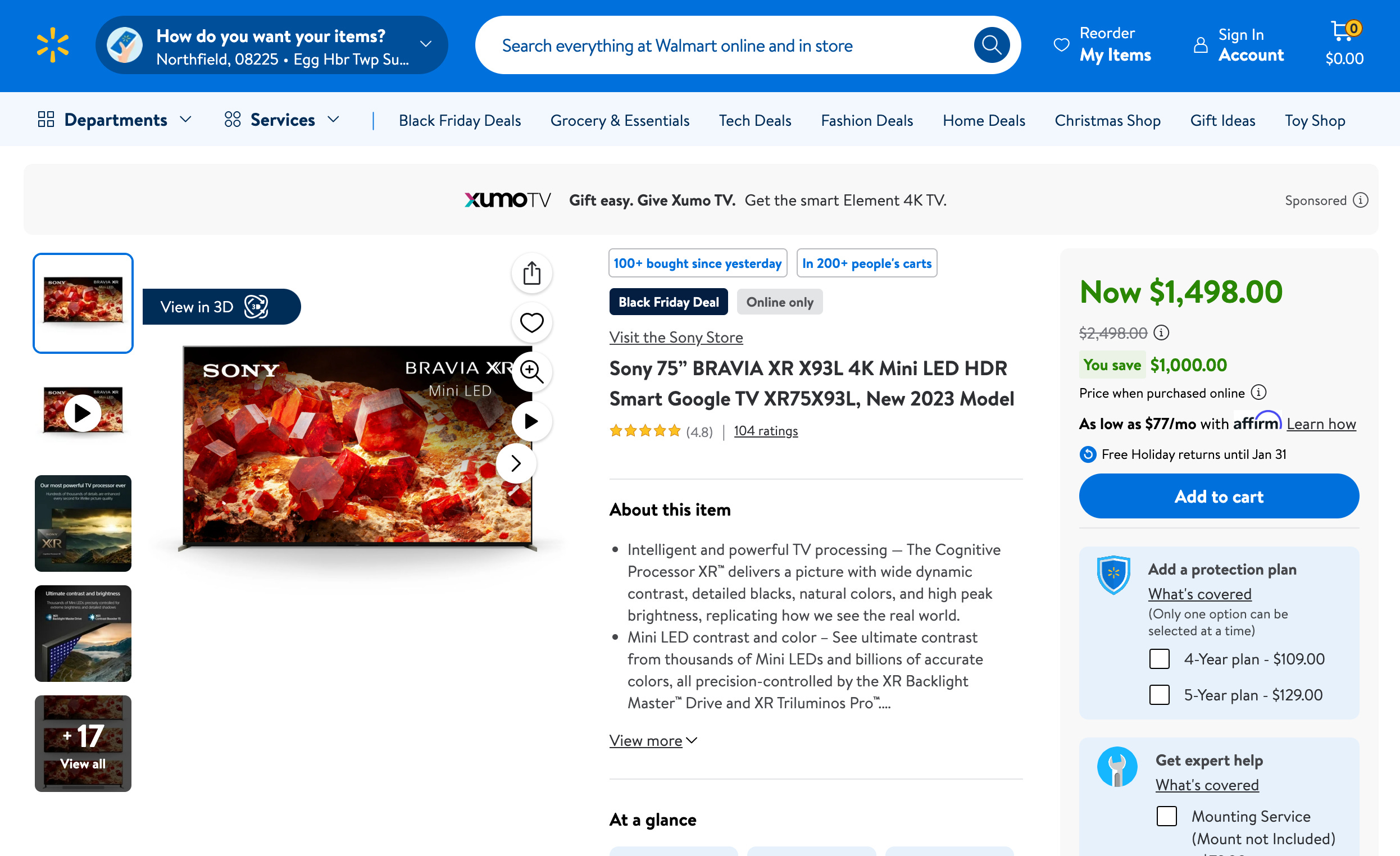 Walmart: Sony 75-inch Bravia XR X93L 4K Mini LED TV - $1,498 (was $2,498)