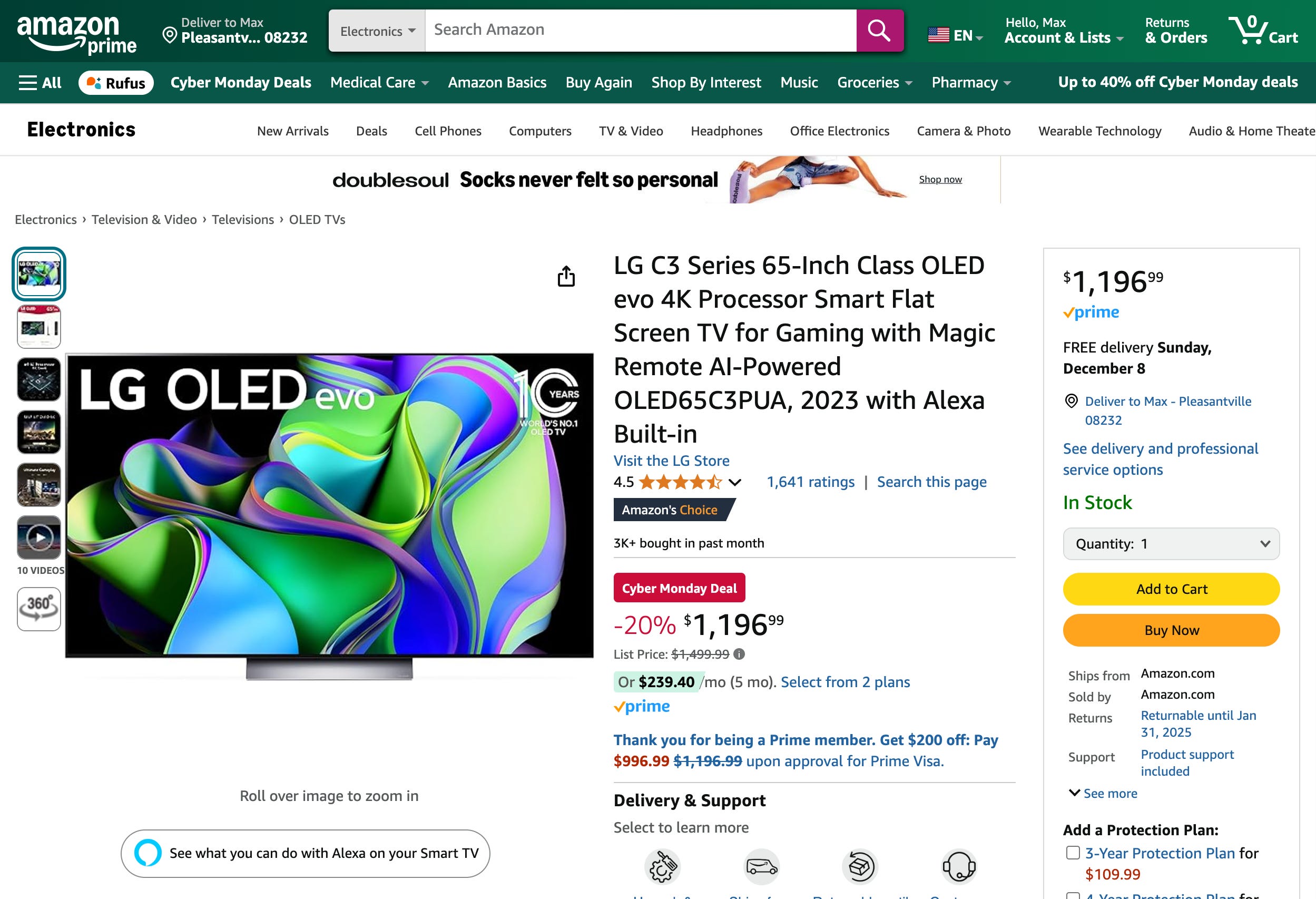 Amazon: LG 65-inch C3 Series OLED 4K Smart TV with AI - $1,196.99 (was $1,499.99)