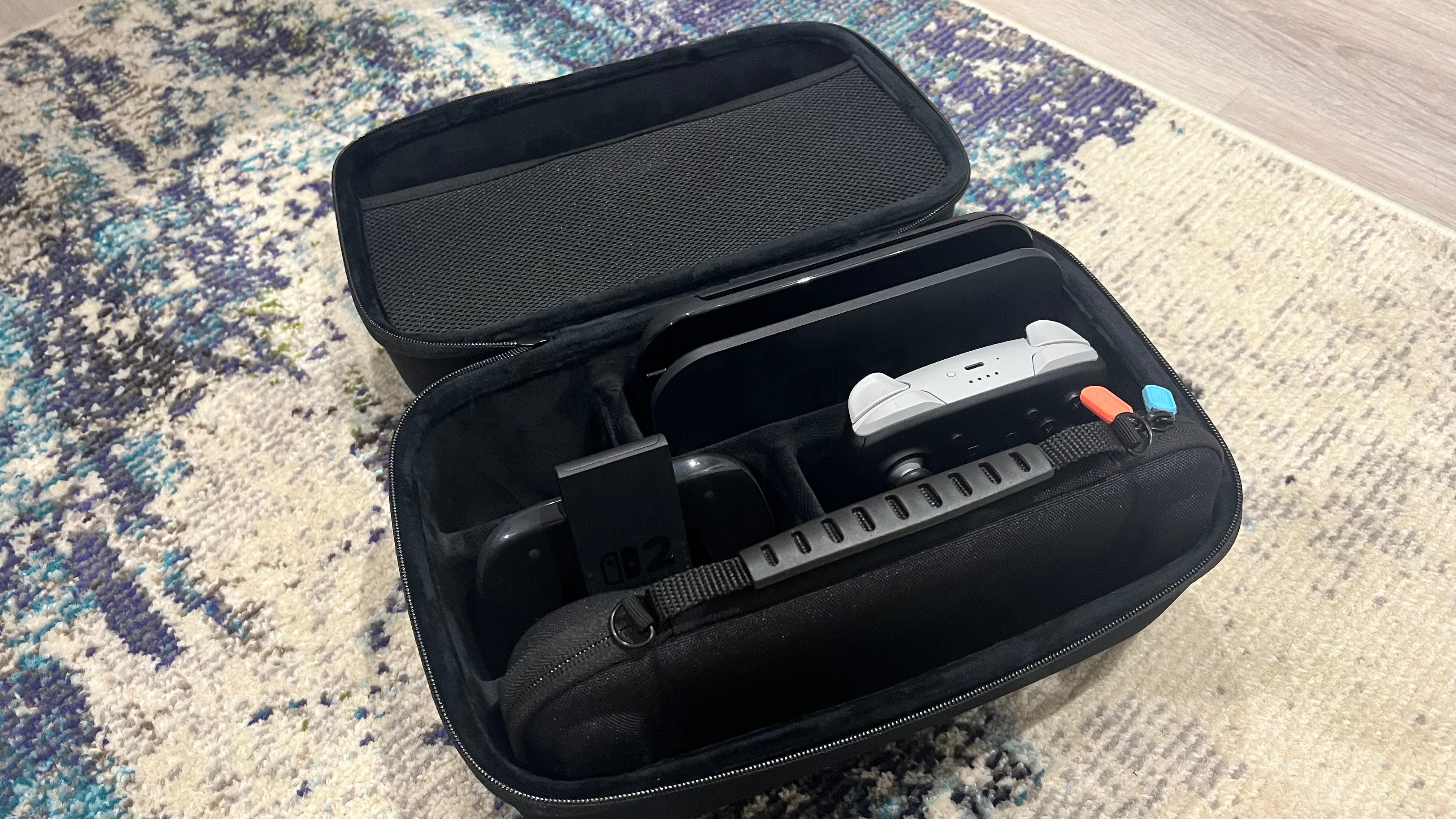 There’s room for the Nintendo Switch 2 dock, power supply, cables, Nintendo Switch 2 Pro Controller, and the system itself. You can also fit in a power bank, a pair of wireless earbuds, or the Joy-Con 2 grip.