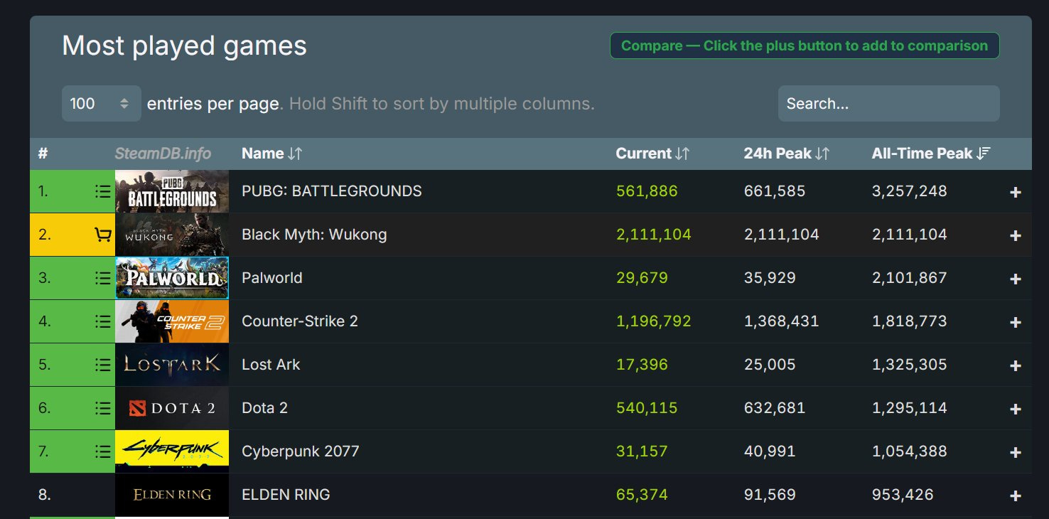 Black Myth: Wukong launched today, and itâs quickly broken a record that few would have expected. The game has become the second most-played game ever on Steam, hitting a 24-hour peak of 2,223,179 players.