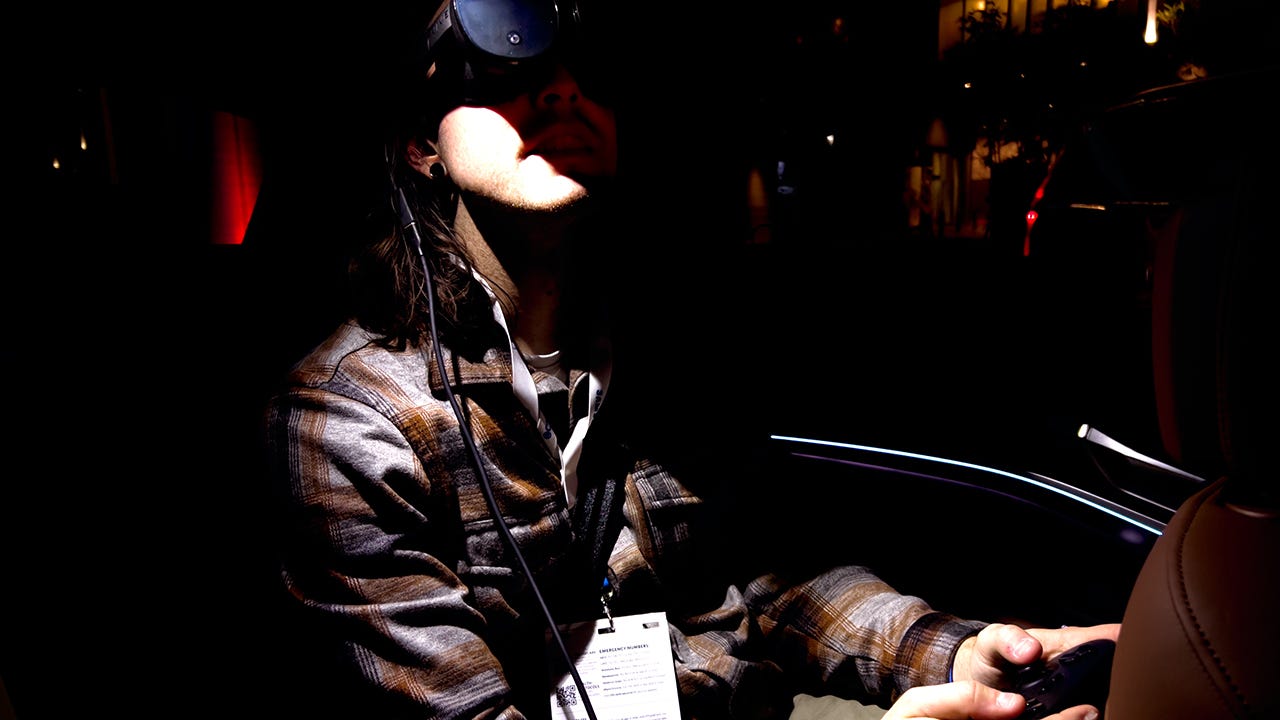 Wearing a VR headset, rear-cabin passengers can explore dynamic virtual environments impacted by the trajectory of the car. In one demo, I simulated the experience of being nine years old in 1995, playing my Game Boy on the way to grandma’s house as my parents bickered in the front. In another, I watched Russian Doll on German Netflix, shown on a massive curved display.
