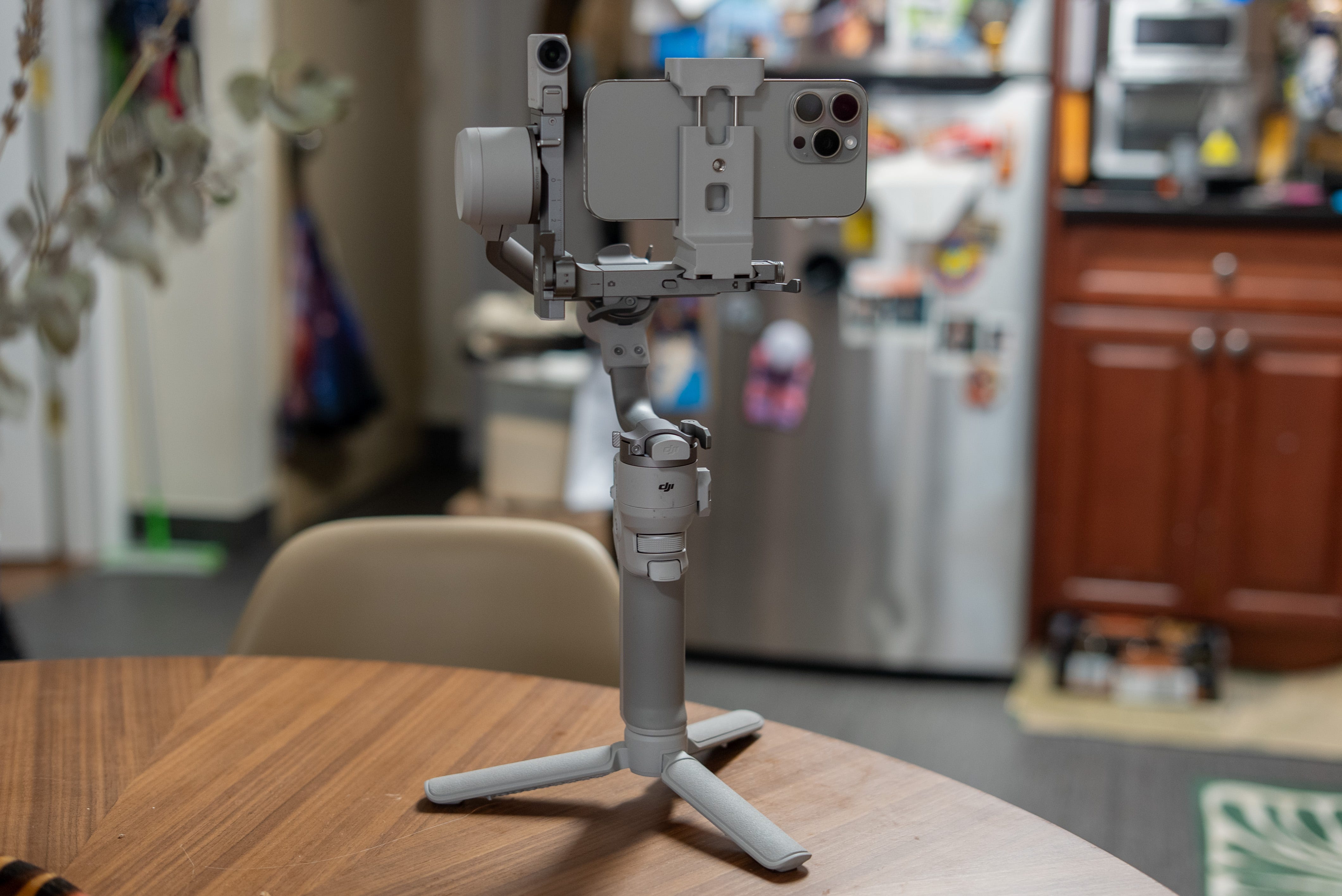 🤳 Smartphone shooting. The DJI RS4 Mini also works with smartphones if you get the phone holder separately or the one included with the top-tier Creator Combo. It looks ridiculous to have a super thin iPhone 16 Pro on top of a much bigger gimbal, but if you want to capture some tracking and/or stabilized footage with your phone, the DJI RS4 Mini will do the trick. I’d recommend the DJI Osmo Mobile 7P and insta360 Flow Pro 2 if you need a gimbal to shoot mostly smartphone video since the AI tracking on both those gimbals is more sophisticated and works more deeply with certain apps.