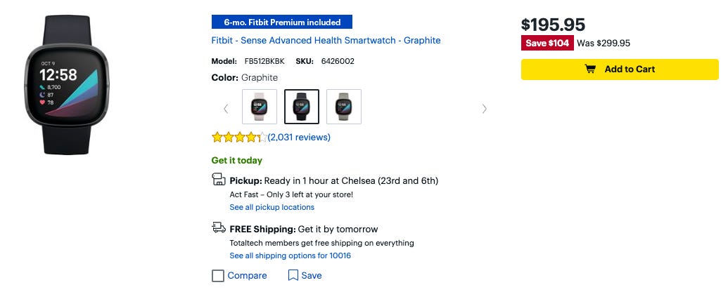 55 Fitbit products are on Best Buy’s site' right now, and most of them have a sale price attached. The biggest dip I see is for Fitbit Sense – $105 off at Best Buy, which has an MSRP of $299.95. Even Fitbit’s own site charges $199.95, so I’m linking to Best Buy, which has an extra $5 off promoted as a Mother’s Day sale.