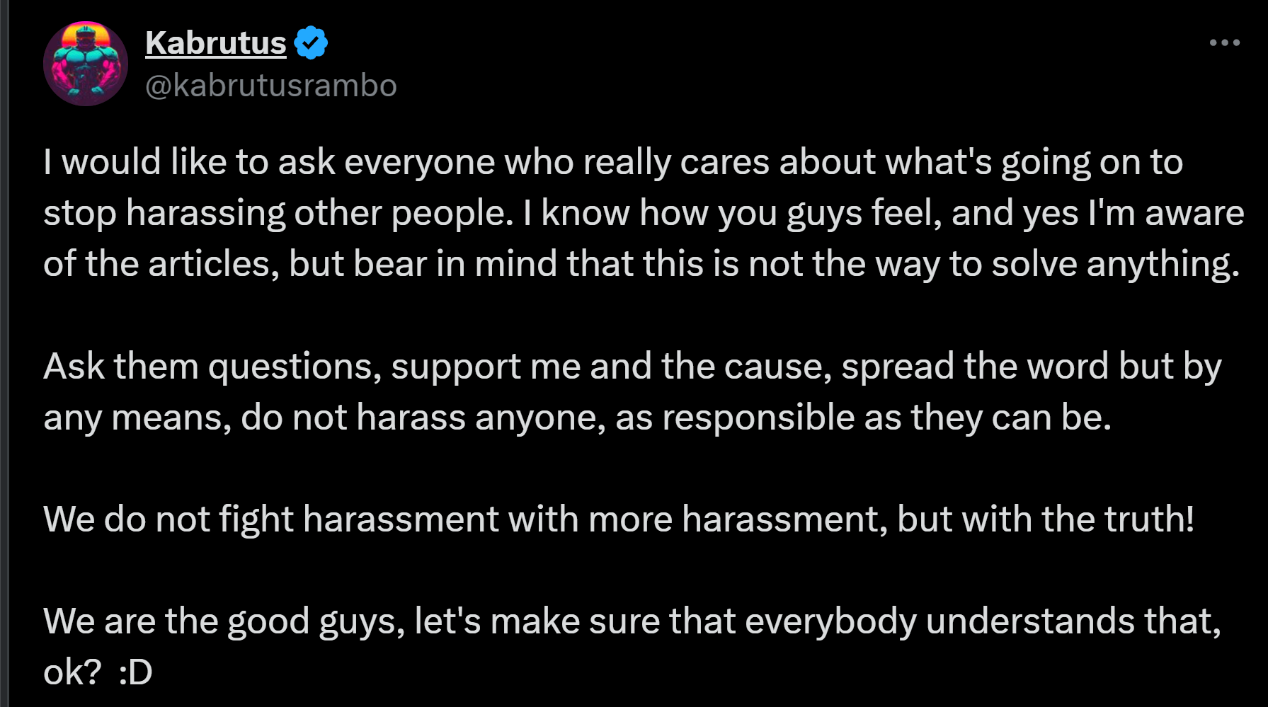 Kabrutus: I made a post on X to make it very clear that I do not endorse this kind of behavior. The truth is on our side, and that’s all we need. Of course, maybe some members of my community see what I say and simply do not agree with that and then proceed to make this kind of stuff, but I have yet to see any tangible proof of this. The last one proved to be sent by a Kotaku journalist’s second account directly to herself [Editor’s note: allegedly]. I'll keep doing my best to avoid this kind of situation from happening again.