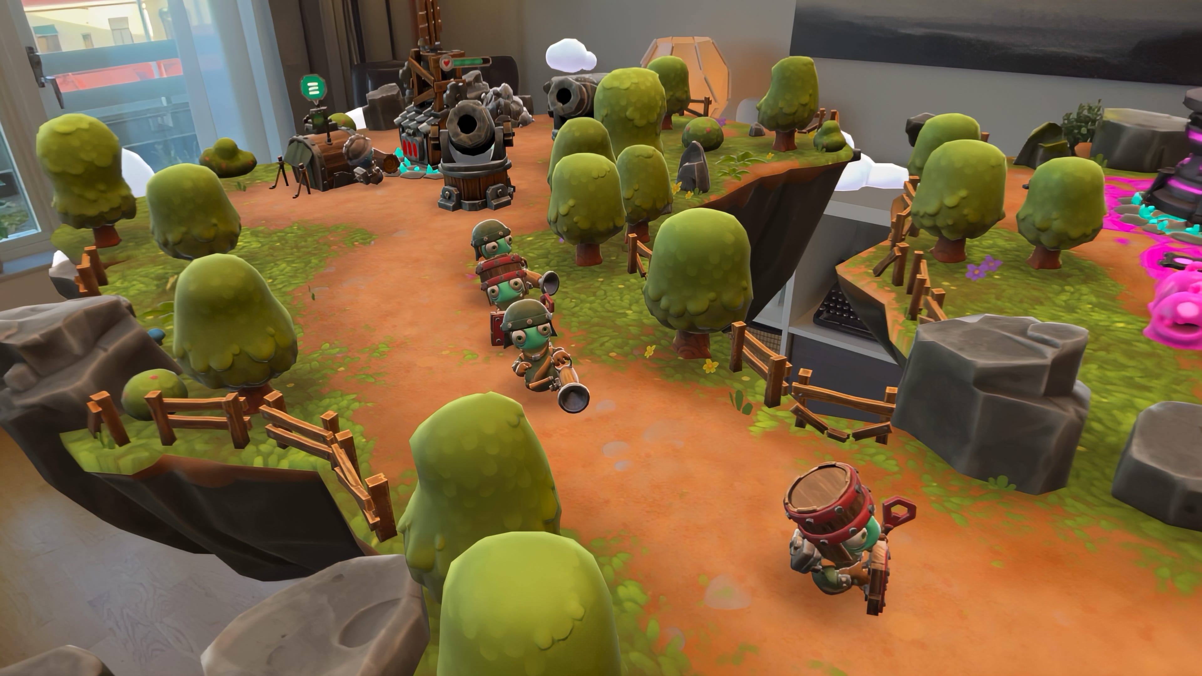 Gears & Goo plays like a classic tower defense game with a twist. Thanks to the Apple Vision Pro headset, I seamlessly pinched and zoomed around the virtual game board while staying aware of the transparent world around me. I could lord over my base and troop build-up with a 40,000-foot view without ever sensing that I left my couch. That “locked in” feeling while wearing a normal VR headset wasn’t present here.