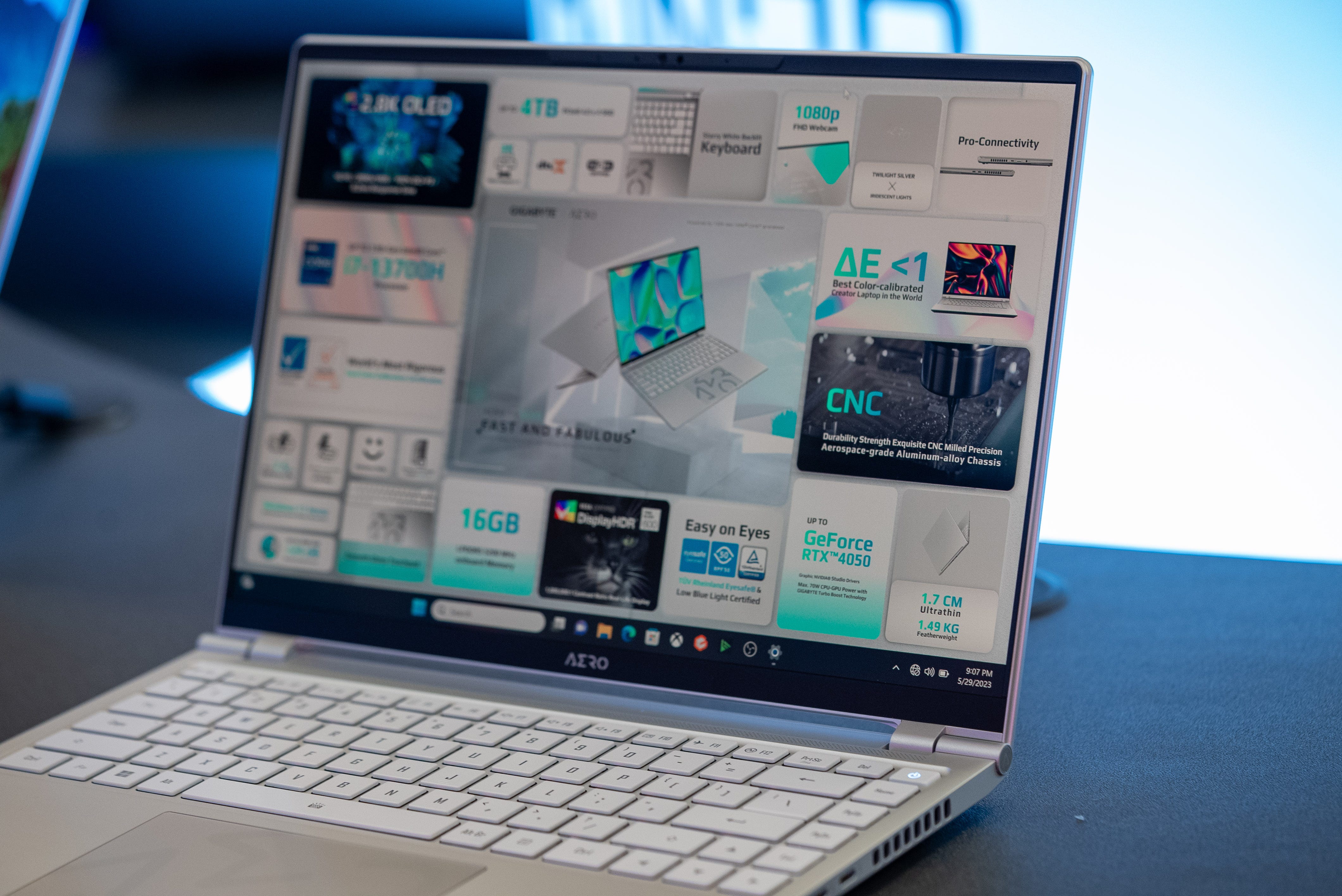 At the heart of the laptop is an Intel Core i7-13-700H processor and Nvidia GeForce RTX 4050 graphics chip. On paper the 14-core and 20-thread CPU should get you through a day of power tasks and the extra GPU grunt helps with image/video editing and other graphics heavy workloads. Of course, at the Computex showroom we only got to sample the Aero 14’s performance with some light webbrowing, so we’ll have to test this machine’s full capabilities in a full review.