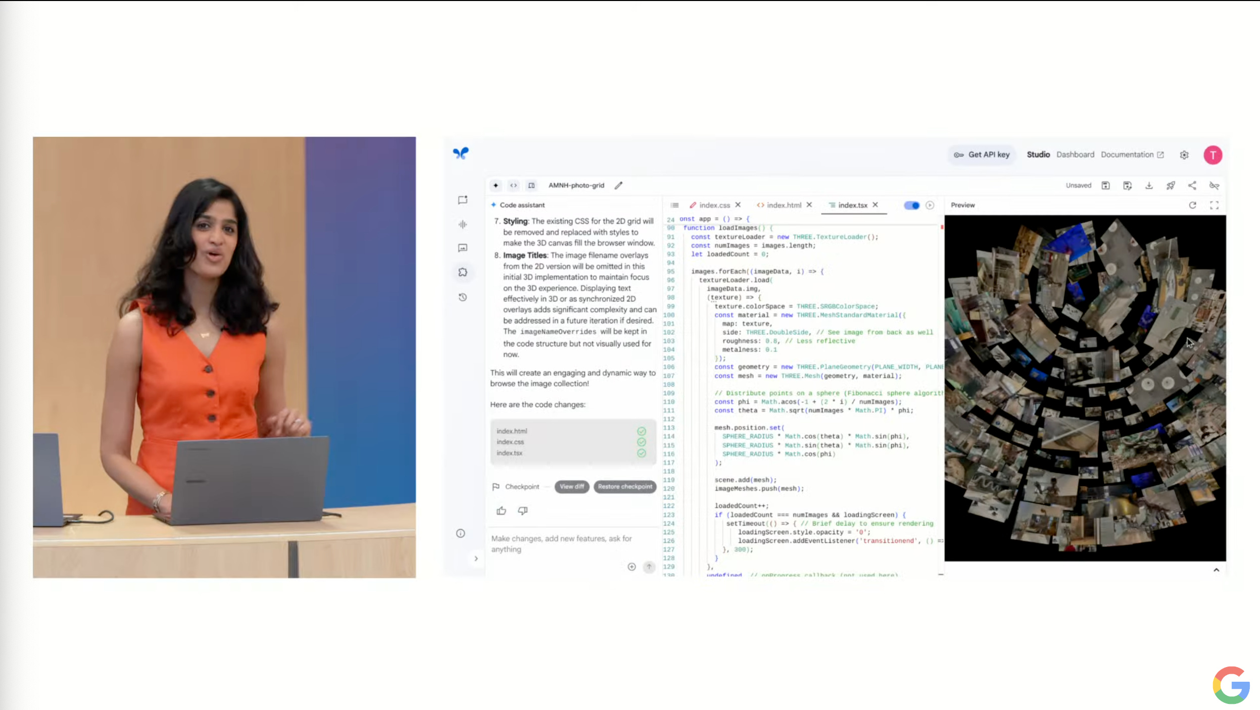 1:31 PM ET: Google showed a demo of Gemini 2.5 in Googleโs AI Studio that edited the code of a photo gallery app to add a 3D sphere effect for viewing photos, all based on a rough sketch of what they wanted the effect to do. Very impressive.