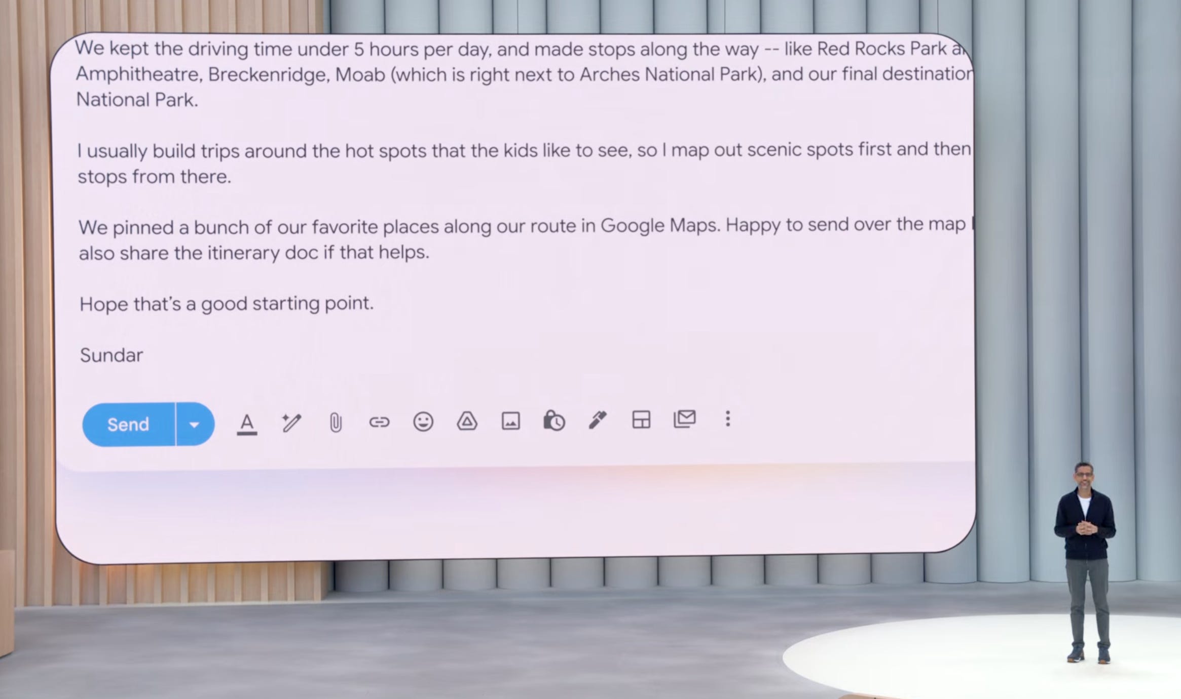 1:19 PM ET: Gmail is getting more personalized responses. Using Gemini, Gmail will be able to generate full replies to emails based on how you sound in your previous emails. The demo on stage seemed pretty impressive. Itโs rolling out this summer to subscribers.