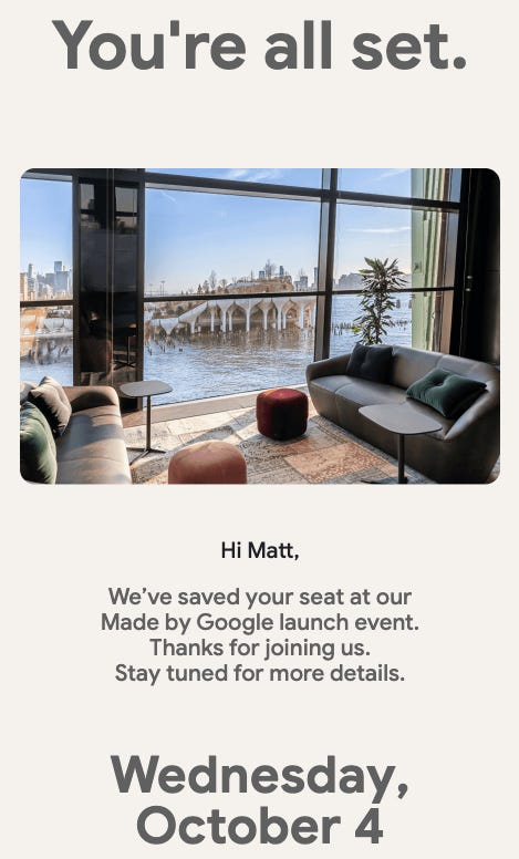 The Made by Google event date is October 4 and it starts at 10am ET in New York City. That’s where Kevin and I from The Shortcut are located, so at least one of us will be there in person, if not both. Expect to see Google broadcast the Pixel 8 launch event via YouTube (considering Google owns YouTube), which means we’ll embed the live stream right here on The Shortcut. Full news coverage to follow.