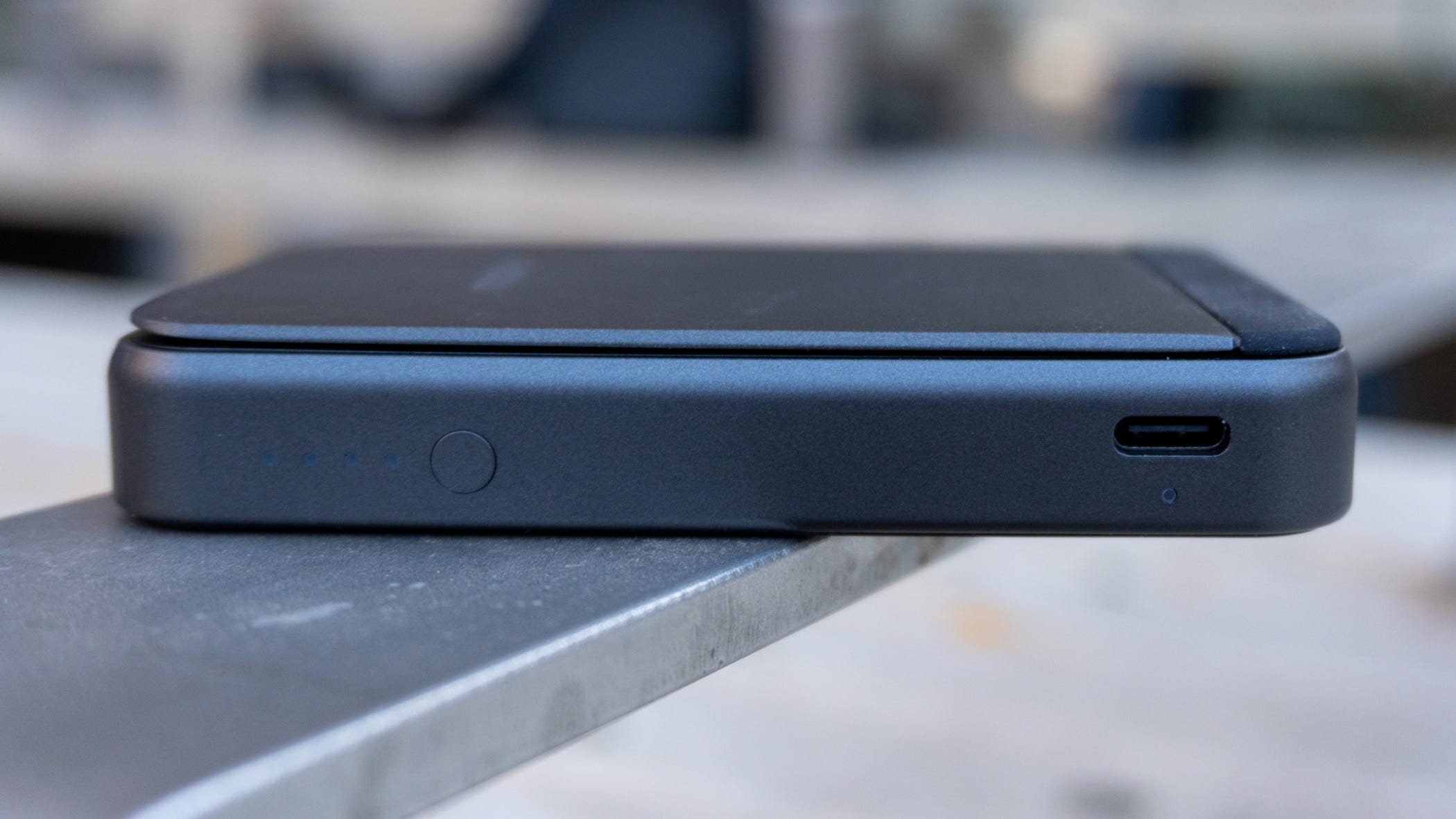 š Compact design with some heft. The design is what youād expect from a portable power bank. It comes with a gray/black finish with a premium feel in the hand, a silicone finish where the magnets are located, and a status indicator so you can check to see how much juice you have left. It connects to your phone magnetically using MagSafe for wireless charging, and you have the option to connect a cable to the charger to juice it up quicker (or to use the power bank to charge other devices).
