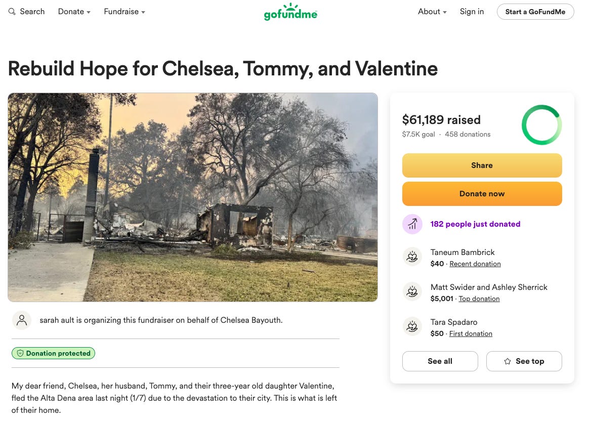 I donated $5,001 to the GoFundMe for Tommy, his wife & my friend Chelsea Bayouth, and their 3-year-old daughter Valentine, who lost everything but thankfully escaped to safety. It’s going to take a lot for them to rebuild their lives.