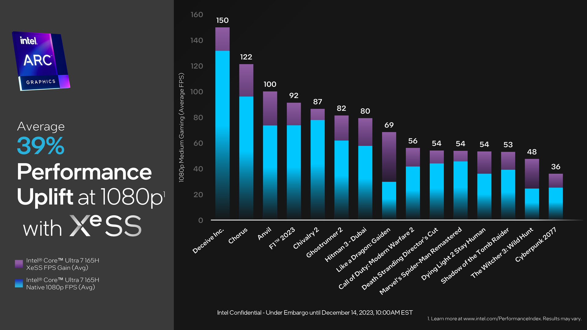 Another big graphics improvement Intel Core Ultra offers is AI-powered Xe Super Sampling (XeSS). Like Nvidia DLSS, this AI-based super sampling helps upscale titles from a lower resolution so you can get a higher-resolution gaming experience while maintaining high frame rates. With it, we were able to play GhostRunner II on a regular consumer laptop with frame rates well above 60fps.