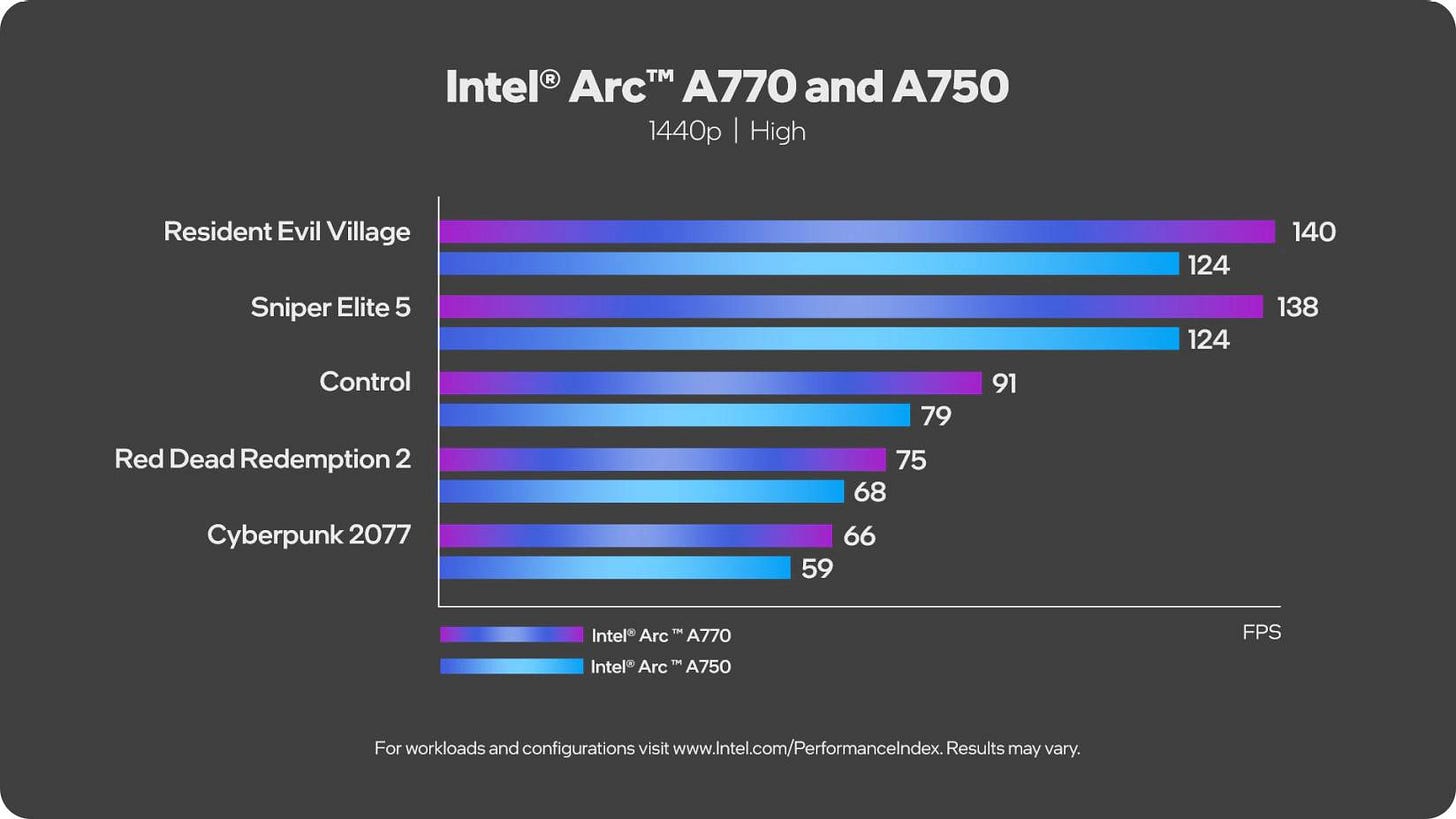 Intel has shared some impressive performance in several major titles at 1440p, running at high settings. Resident Evil Village will be able to run at over 120fps, while the taxing Cyberpunk 2077 should deliver a solid 60fps experience.