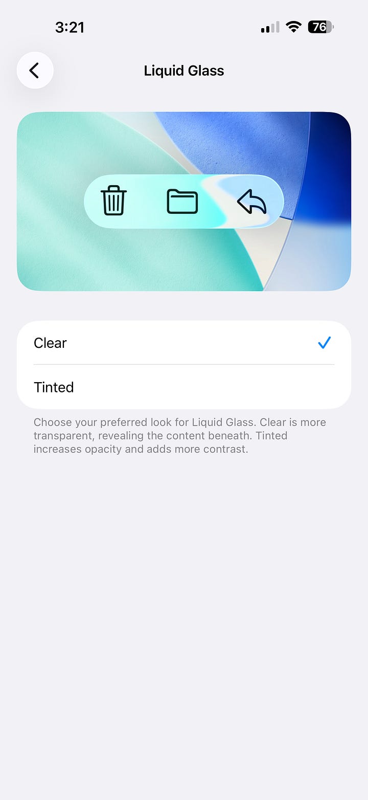❄️ Liquid Glass gets frosty. The new “Tinted” version of Liquid Glass adds a white tint to the interface that contrasts nicely with black texts and iconography. The UI is less dependent on switching between dark and light modes to keep text legible, and it’s much more in line with older versions of iOS. It looks similar to previous versions of iOS 26 that frosted the glass everywhere, except this time, it’s a bit more extreme.