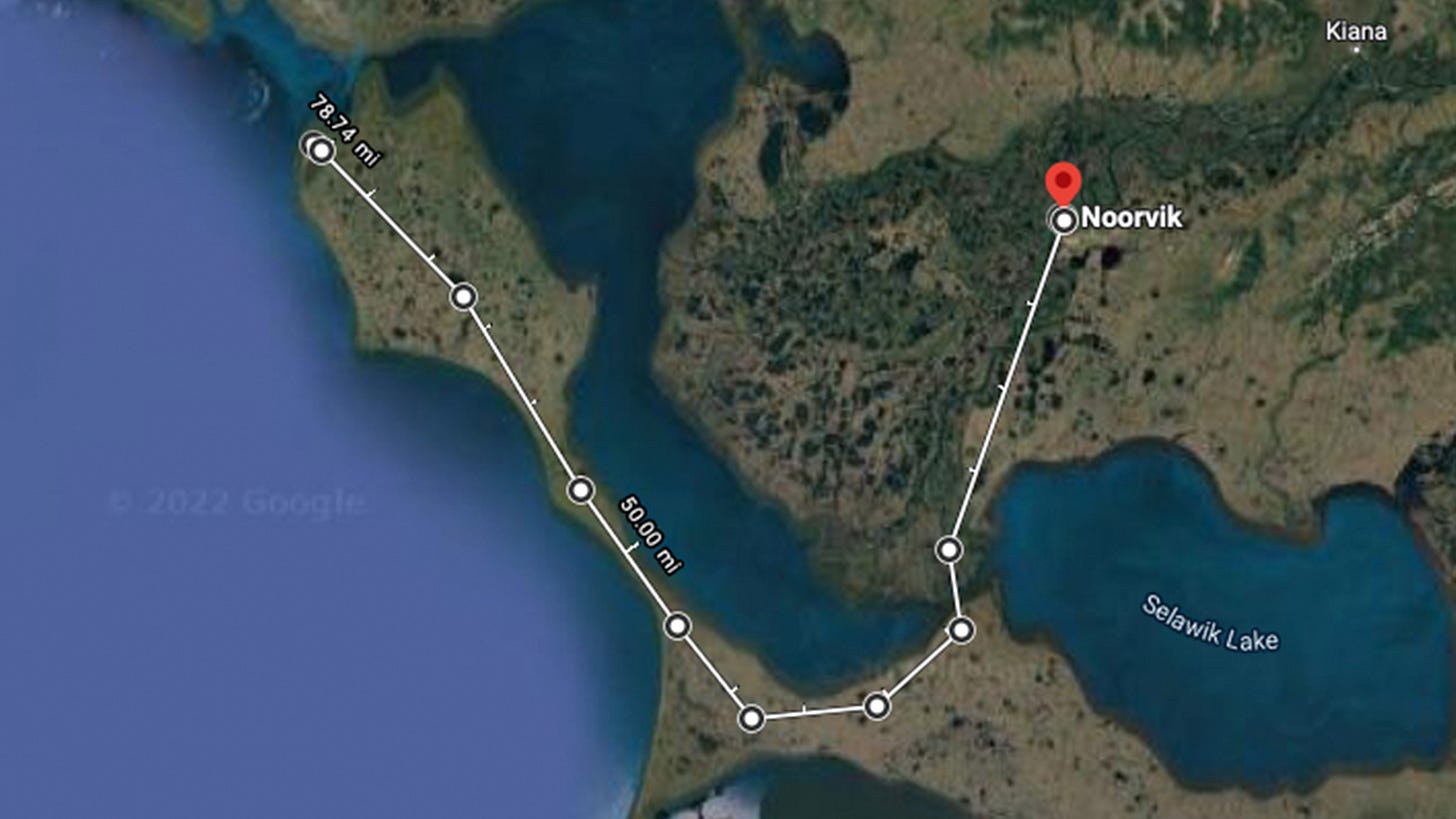 Alaskan state troopers reportedly said they were impressed with the thorough, accurate information they were given by the alert, which they received around 2am local time Thursday morning. Evidently, the man was traveling by snow machine between two remote towns – Noorvik, AK and Kotzebue, AK – a trip that may have ranged from 78 miles to 128 miles, at least according to the routes I charted using Google Maps (I have no knowledge of the terrain, but it appears no roads connect the towns, so I made a couple of best guesses).