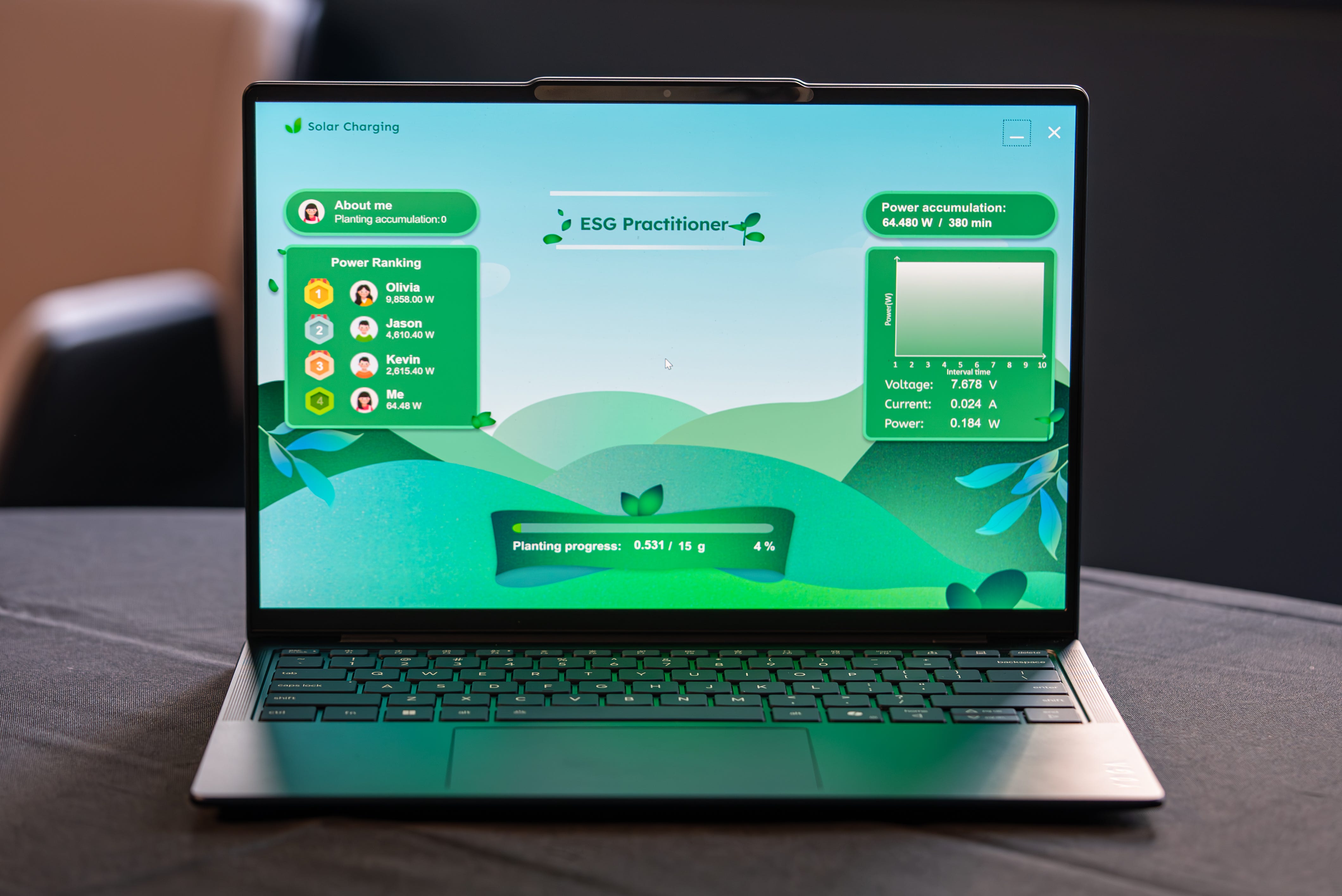 Lenovo designed some fun software exclusively for its solar laptop concept. Thereās a working energy meter that shows how much sunlight is being drawn in by the laptop. I covered that lid to see the conversion rate drop in real time. I then turned it to a sunlit window and the meter jumped back up ā proof it was working.