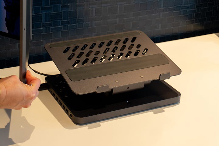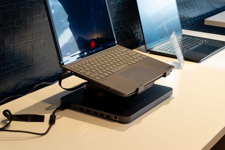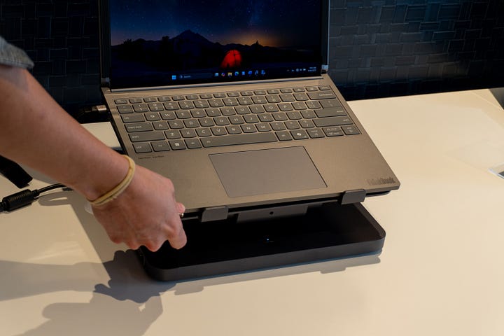 In addition to the VertiFlex concept, Lenovo also unveiled the Smart Motion Concept, a laptop stand that can intelligently adjust itself so that your laptop is in the perfect position to use. It can automatically adjust its height, the position of your display, and more using a bunch of different sensors. Thereās even a ring you can wear that lets you control it with air gestures. This concept seemed more far-fetched than the ThinkBook, but somewhat practical nonetheless.
