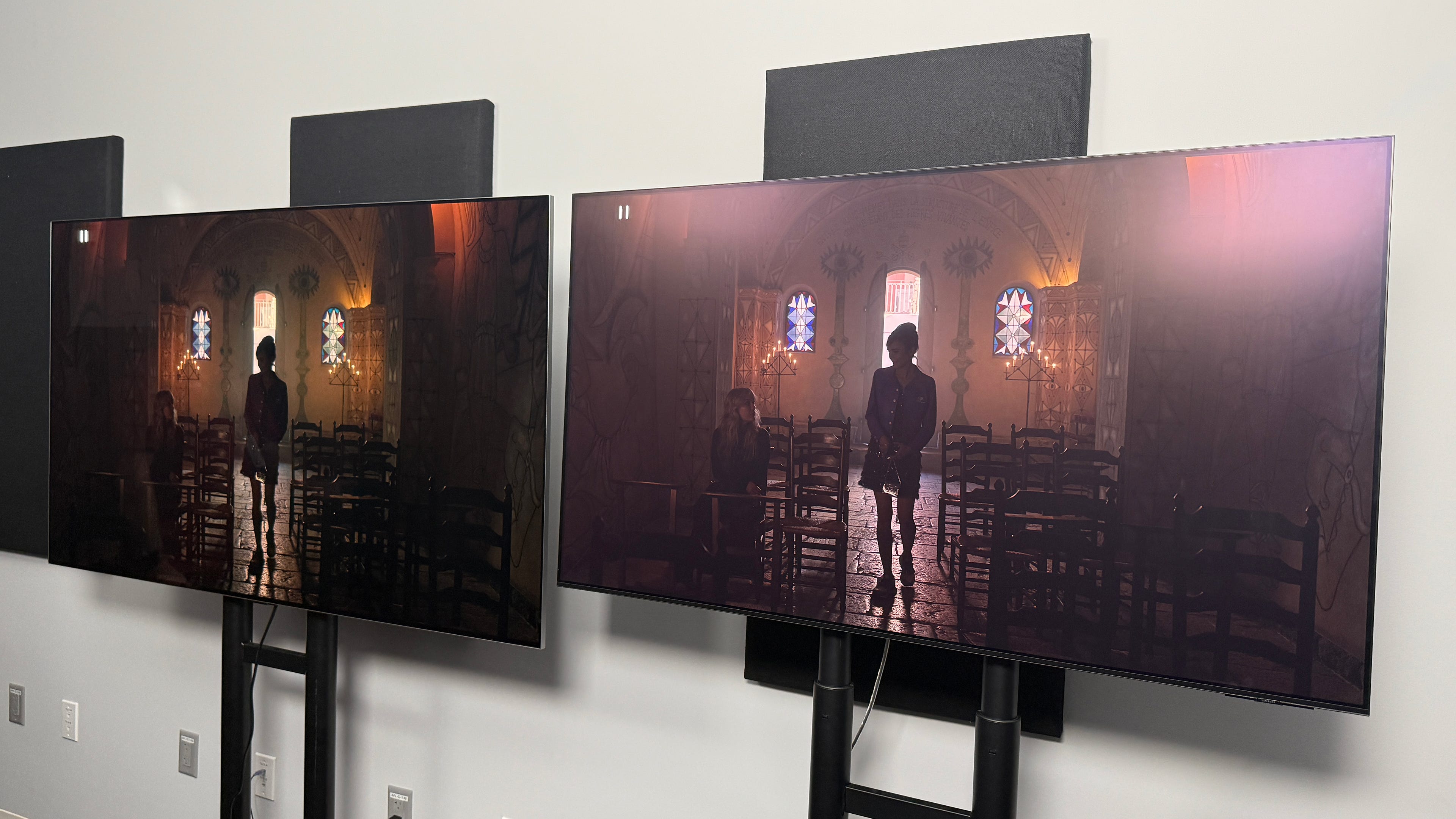 🪞 Fewer (but not no) reflections. The LG G5 still features a glossy screen but it has a new anti-reflective coating that claims to reduce any reflected light down to 0.6%. We saw how well it competed with the Samsung S95D QD-OLED 4K TV’s almost matte coating, and as you can see, the Samsung TV basically became washed out with almost gray-colored blacks. There were still a few reflections you could see on the LG G5, but nothing overtly distracting. Of course, this was an extreme case with two massive floodlights pointed toward the ceiling, no one is going to watch TV with that type of lighting – let alone have it at home.