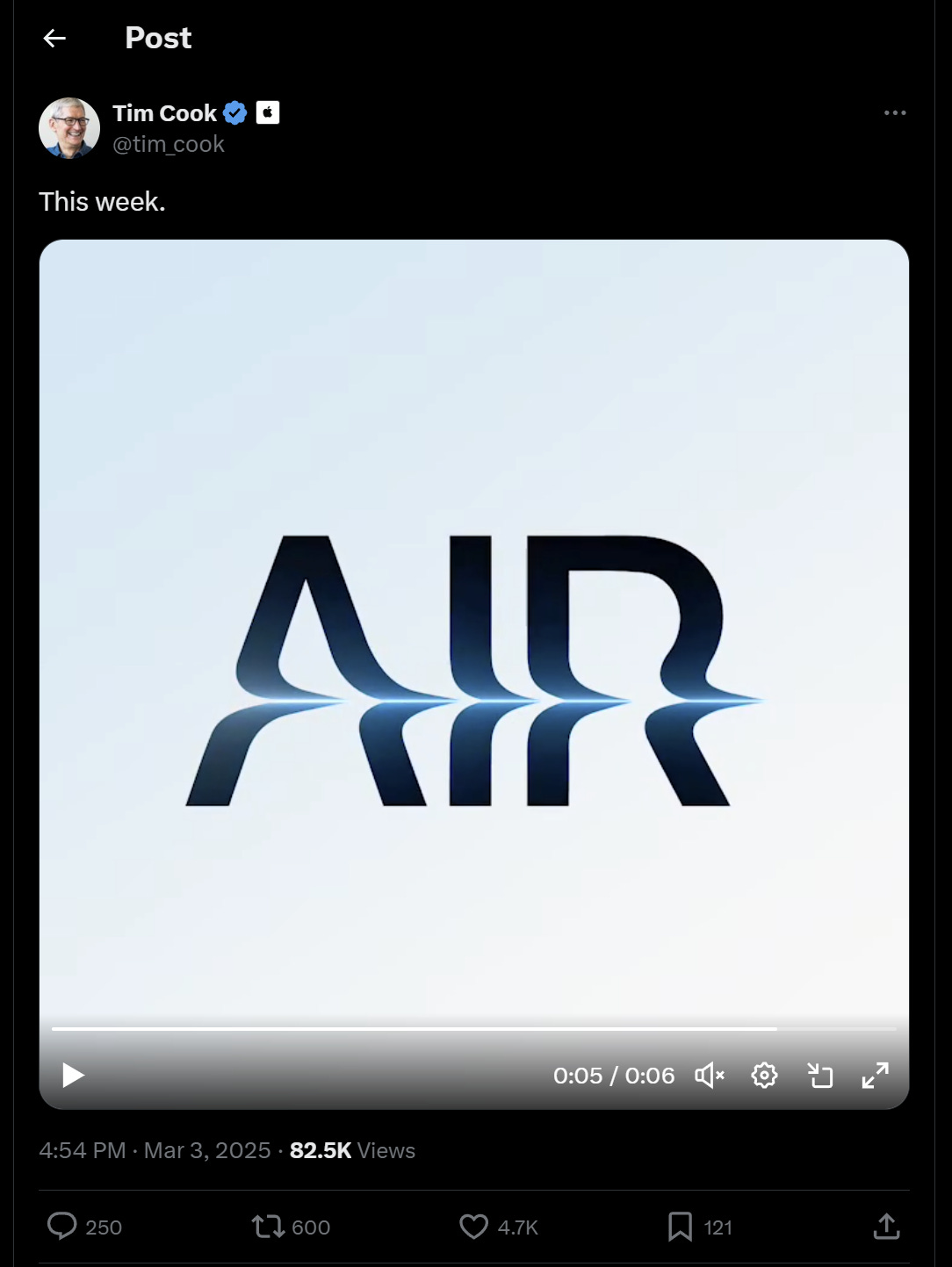 Apple is expected to announce the MacBook Air with M4 this week, and it looks like Tim Cook mightāve just confirmed it. In a new post on social media, Cook shared a video teasing the āAirā wordmark and commenting āThis week.ā It doesnāt take a tech genius to figure out that this probably means a new Air-branded product is coming in the next few days, and all signs point to a refreshed MacBook that weāve been hearing about since last year.