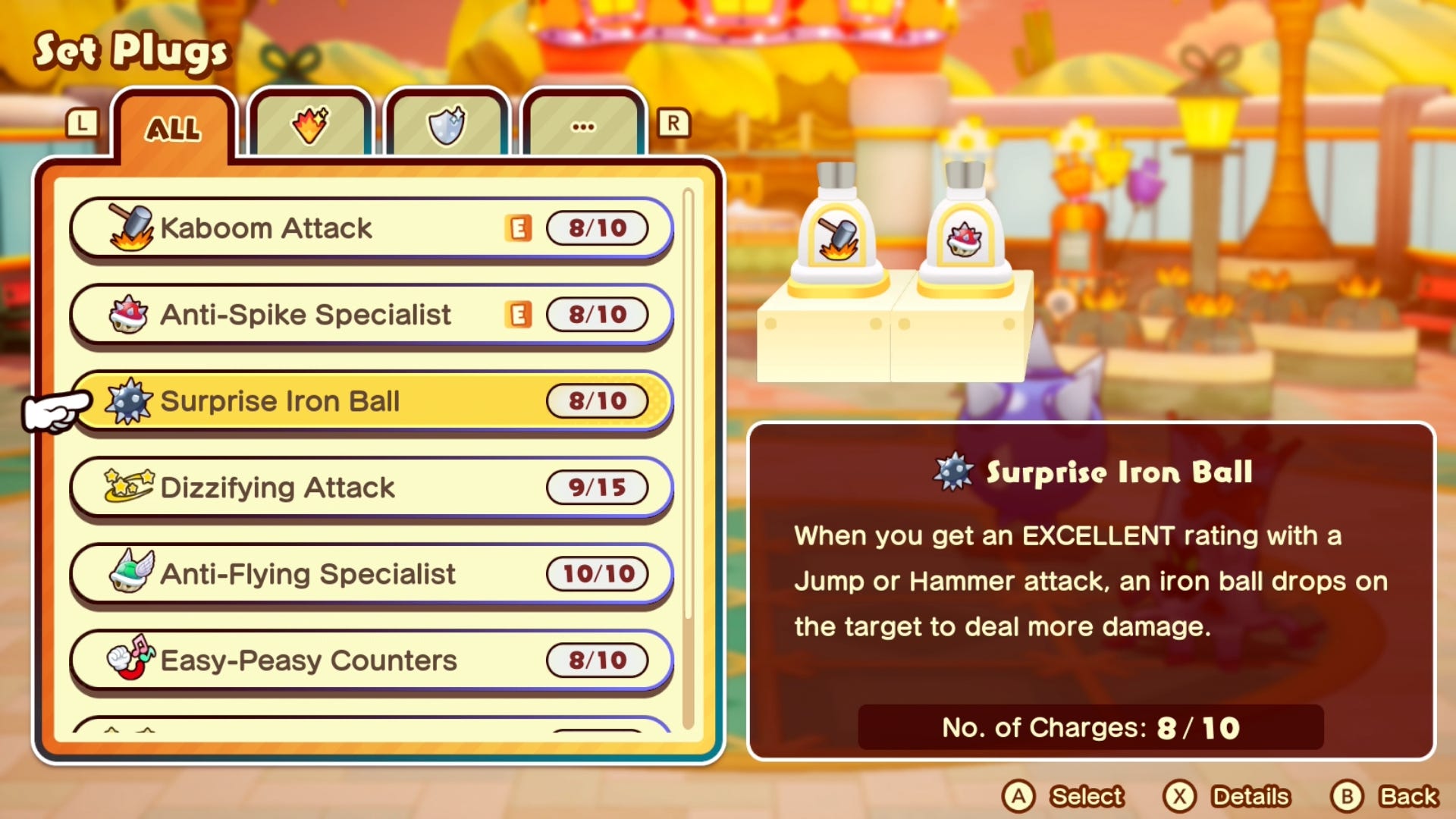 🥊 Laying down the hurt. Specific options like Kaboom Attack add group damage to every jump attack, while Surprise Iron Ball adds extra damage from a spiked metal ball whenever you land an “Excellent” timed attack. Battle Plugs can also combine together to produce more powerful effects; like Kaboom Attack and Surprise Iron Ball together create a special Iron Ka-Ball effect that drops drop spiked metal balls on all enemies hit by the shock wave of a Kaboom Attack.