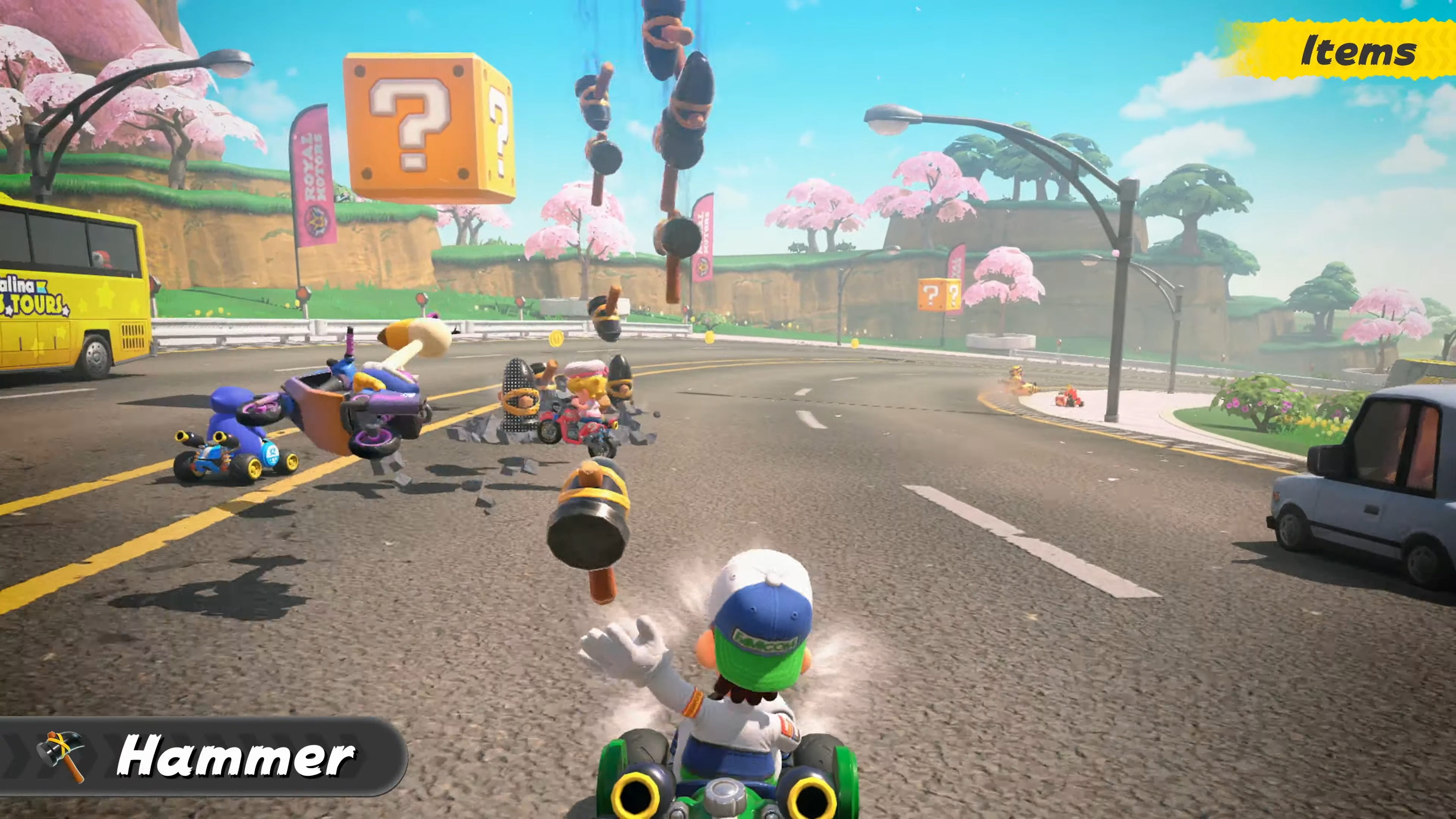 9:06am ET: Knockout Tour is being shown off now. Drive to survive, or you’re out! I can see this being an incredibly popular mode. It’s almost like a battle royale. Almost. Quick look at some new items. Coin shell, Ice Flower, Hammer, Mega Mushroom, Feather, and Kamek are all new to Mario Kart World.