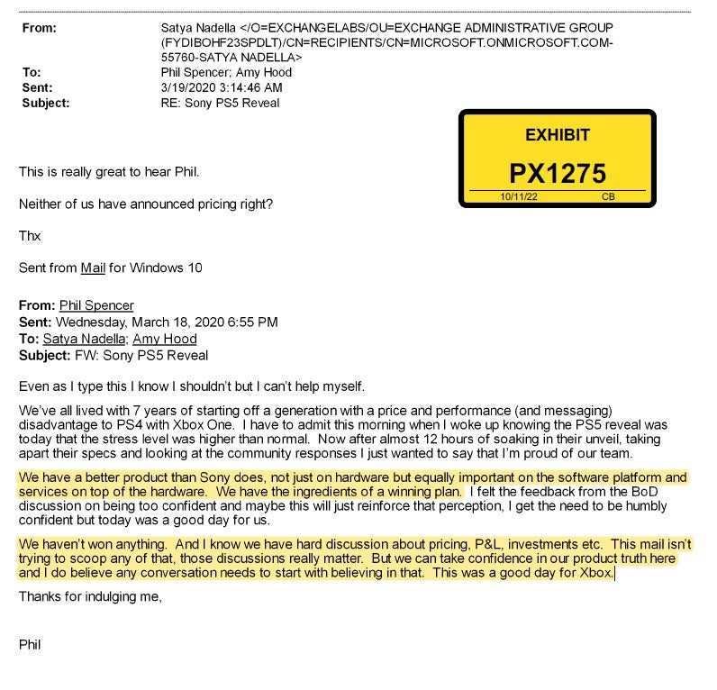 Spencer emailed Microsoft CEO Satya Nadella and chief financial official Amy Hood shortly after Sony revealed the PlayStation 5, and said: “After almost 12 hours of soaking in their unveil, taking apart their specs and looking at the community responses I just wanted to say that I’m proud of our team.”