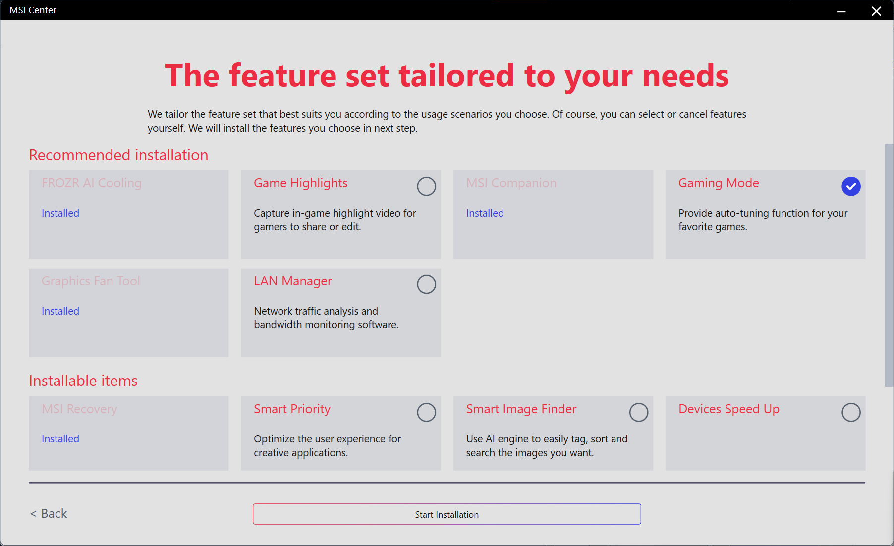 What makes MSI Center actually good is that it doesn’t install everything right away. The first time you open it, it’ll walk you through a setup process that asks what you’ll be using the computer for and suggests relevant software for you to install.