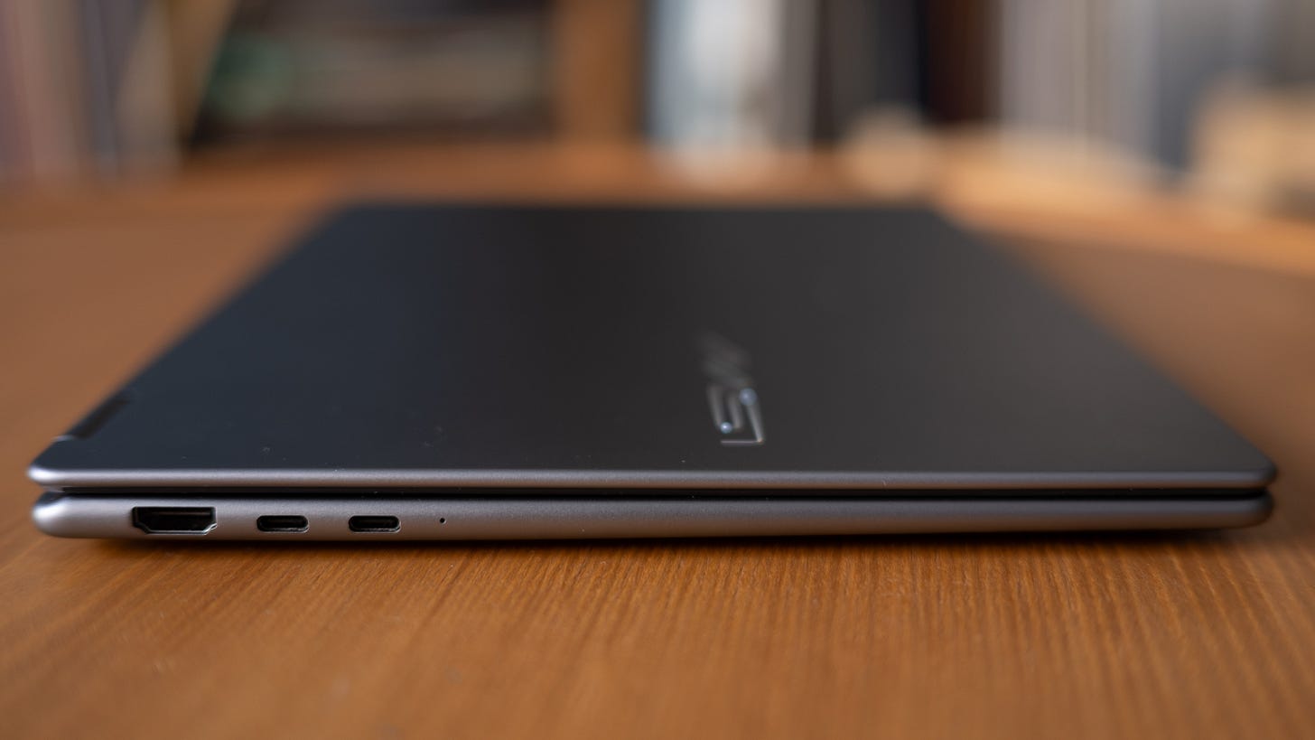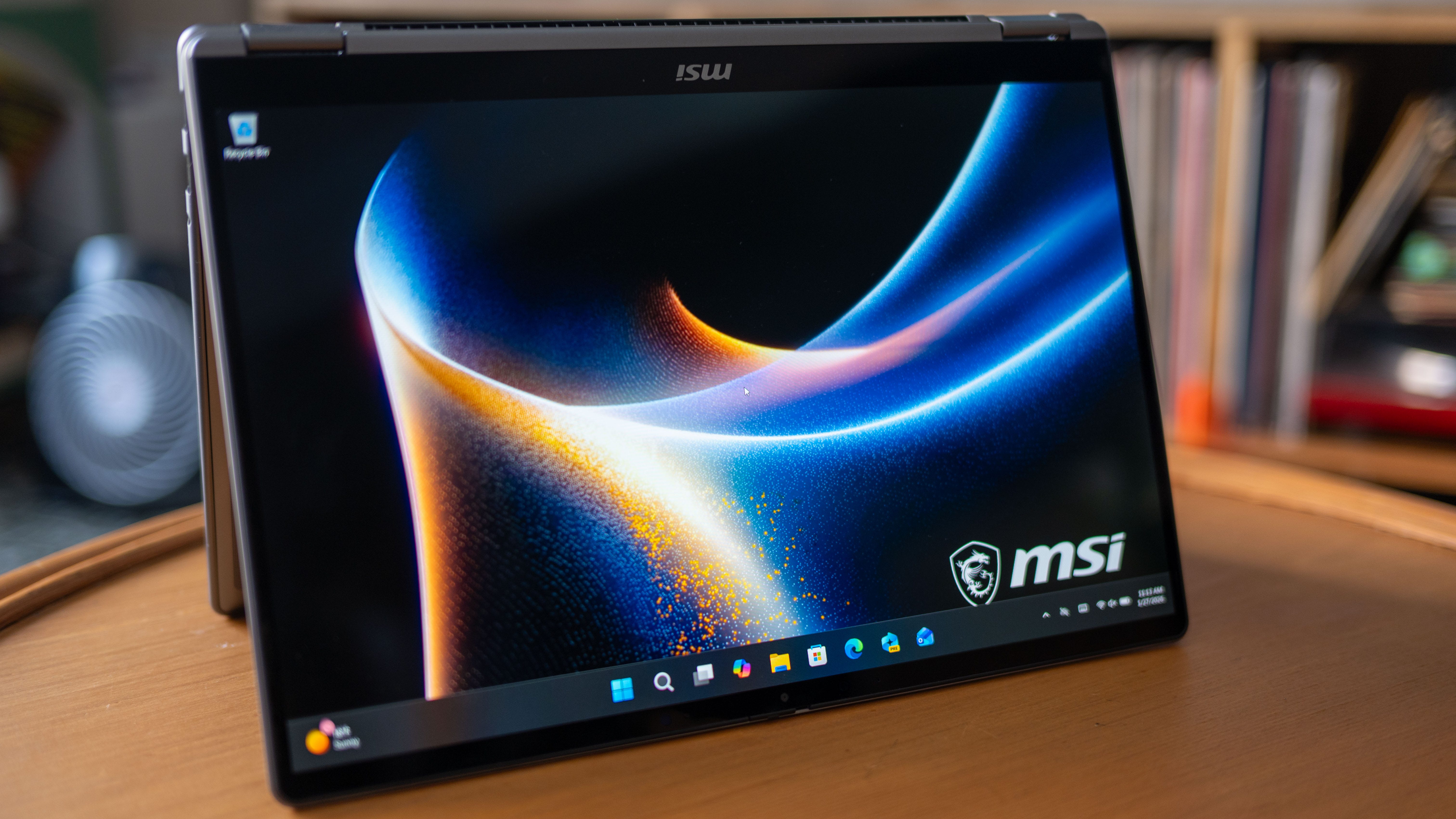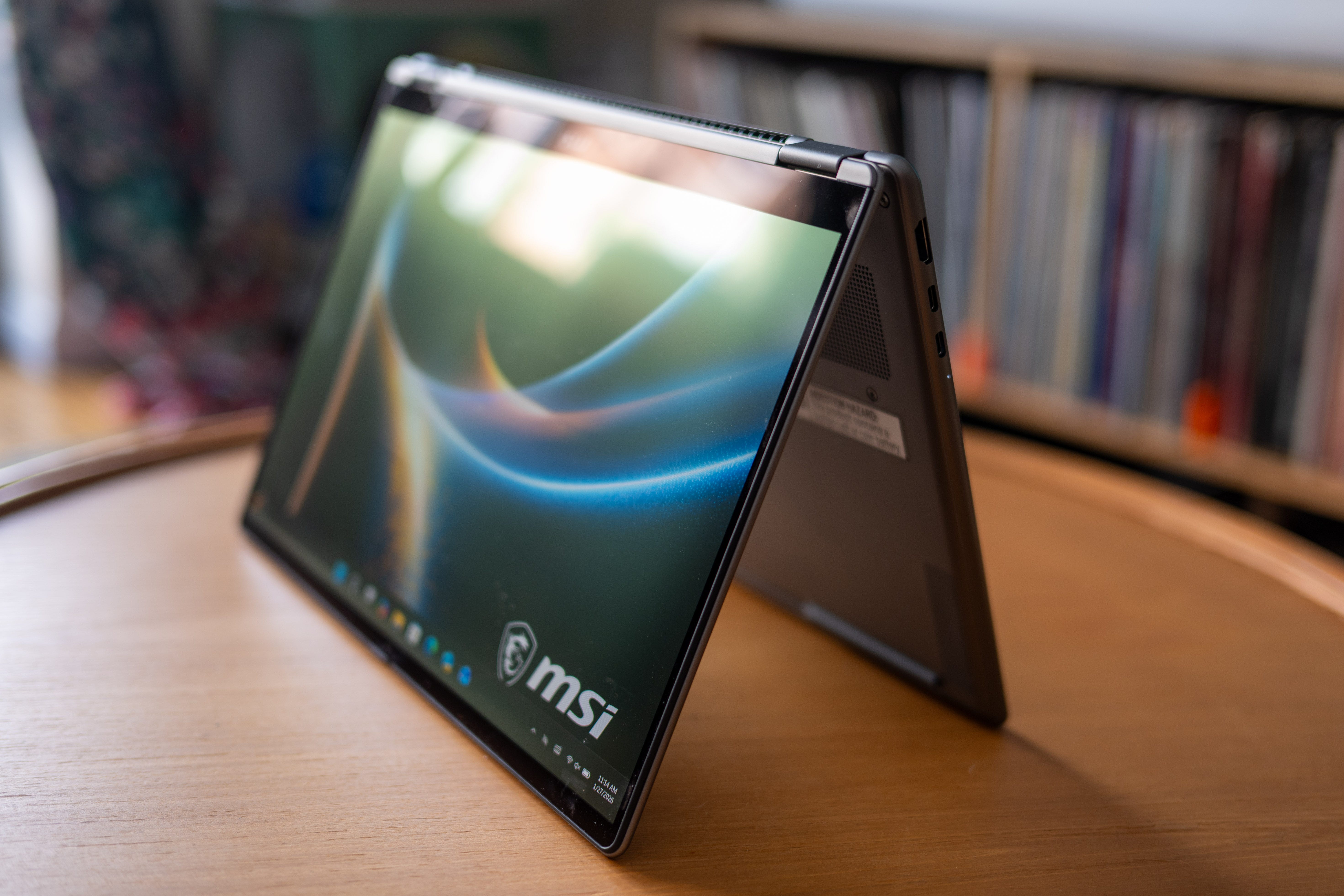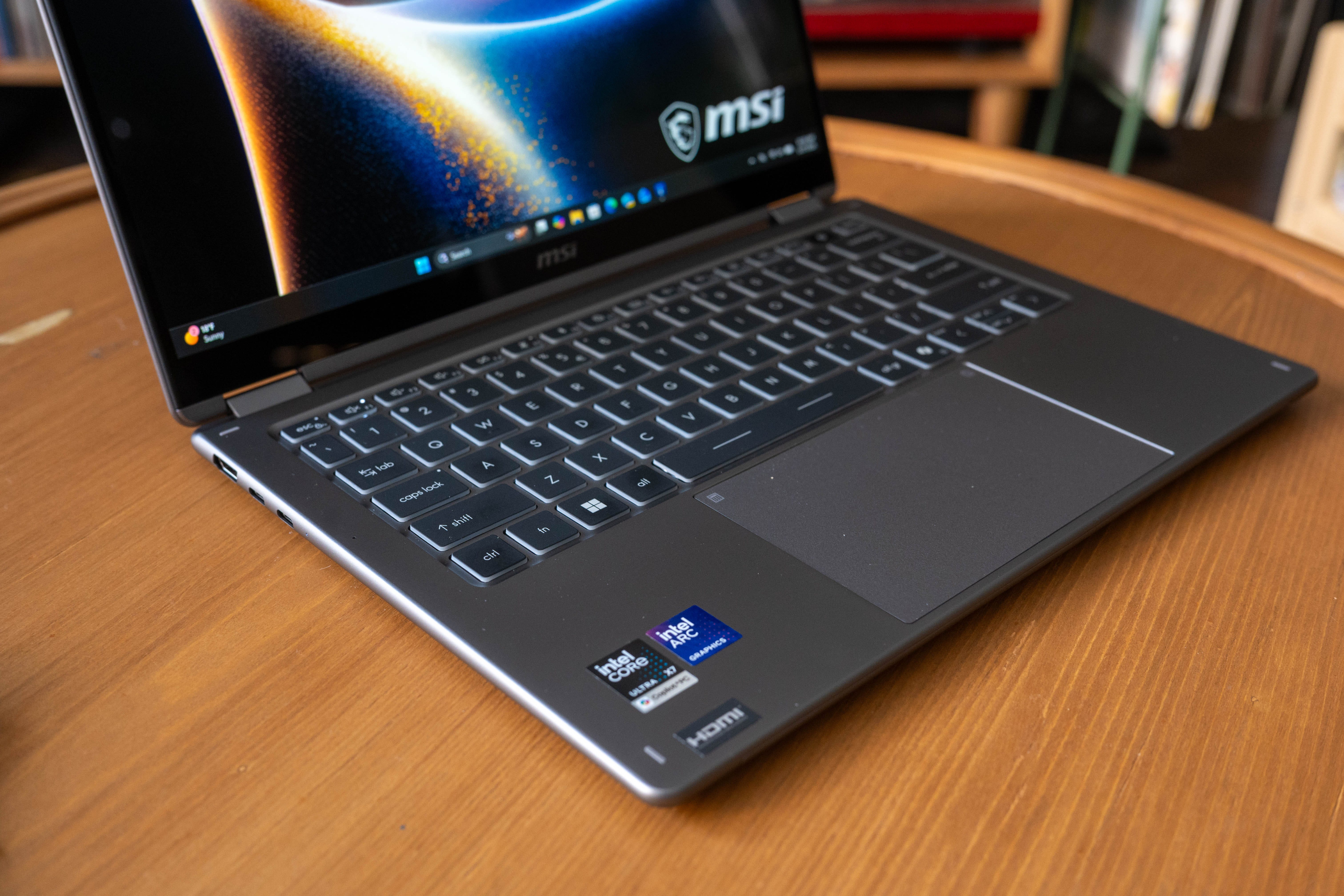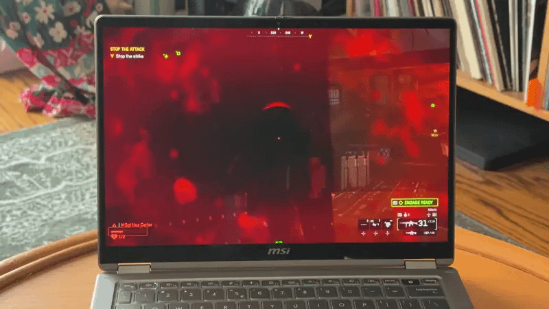 📺 That’s good, that’s bad screen. OLED screens are an automatic plus on any device, but the display MSI chose for this laptop goes like the old Simpsons “that’s good, that’s bad” joke. While OLED displays achieve deep, true blacks, peak brightness is limited to a meager 300 nits, so this laptop’s screen isn’t the easiest to use on a sunny day. Steaming video looks great on this display and plays in HDR, but unfortunately, the Prestige 14 AI+ Flip doesn’t support HDR for gaming. The 60Hz screen is also serviceable, but it’ll feel slow if you’ve gotten used to the iPhones and Android devices with 90Hz-144Hz displays.