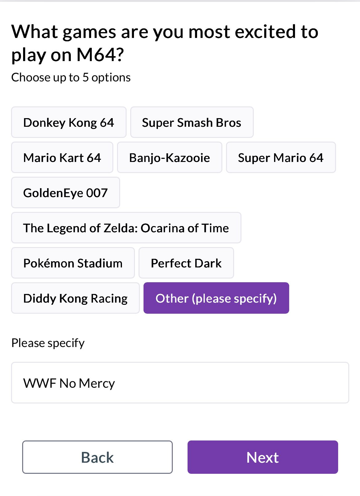 ModRetro also sent an email to ask which color people prefer, along with what games you’re excited to play on the M64. Naturally, I said WWF No Mercy.