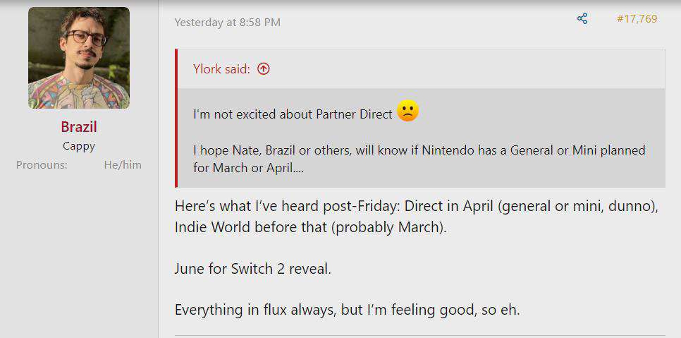 In a forum post, Lippe wrote: “Here’s what I’ve heard post-Friday: Direct in April (general or mini, dunno), Indie World before that (probably March). June for Switch 2 reveal. Everything in flux always, but I’m feeling good, so eh.”