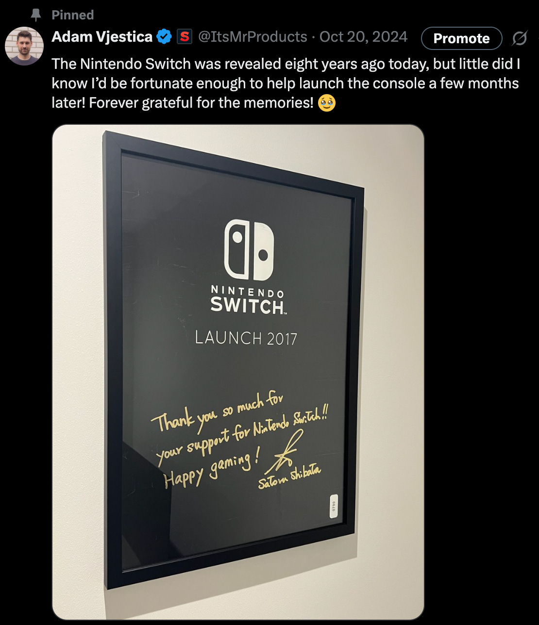 Today’s announcement is extra special to me, personally. I was fortunate enough to join Nintendo a couple of months before the original Switch launched eight years ago. Don’t believe me? Well, I have a poster to prove it!
