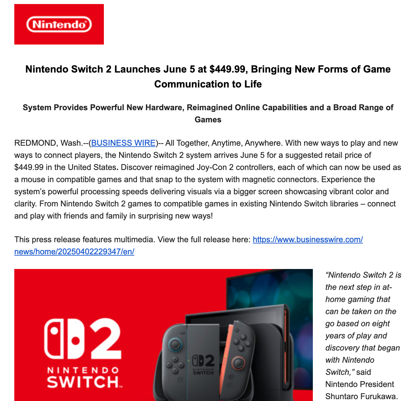 9:24 am ET: The Nintendo Switch 2 release date is June 5. I repeat: June 5, 2025!