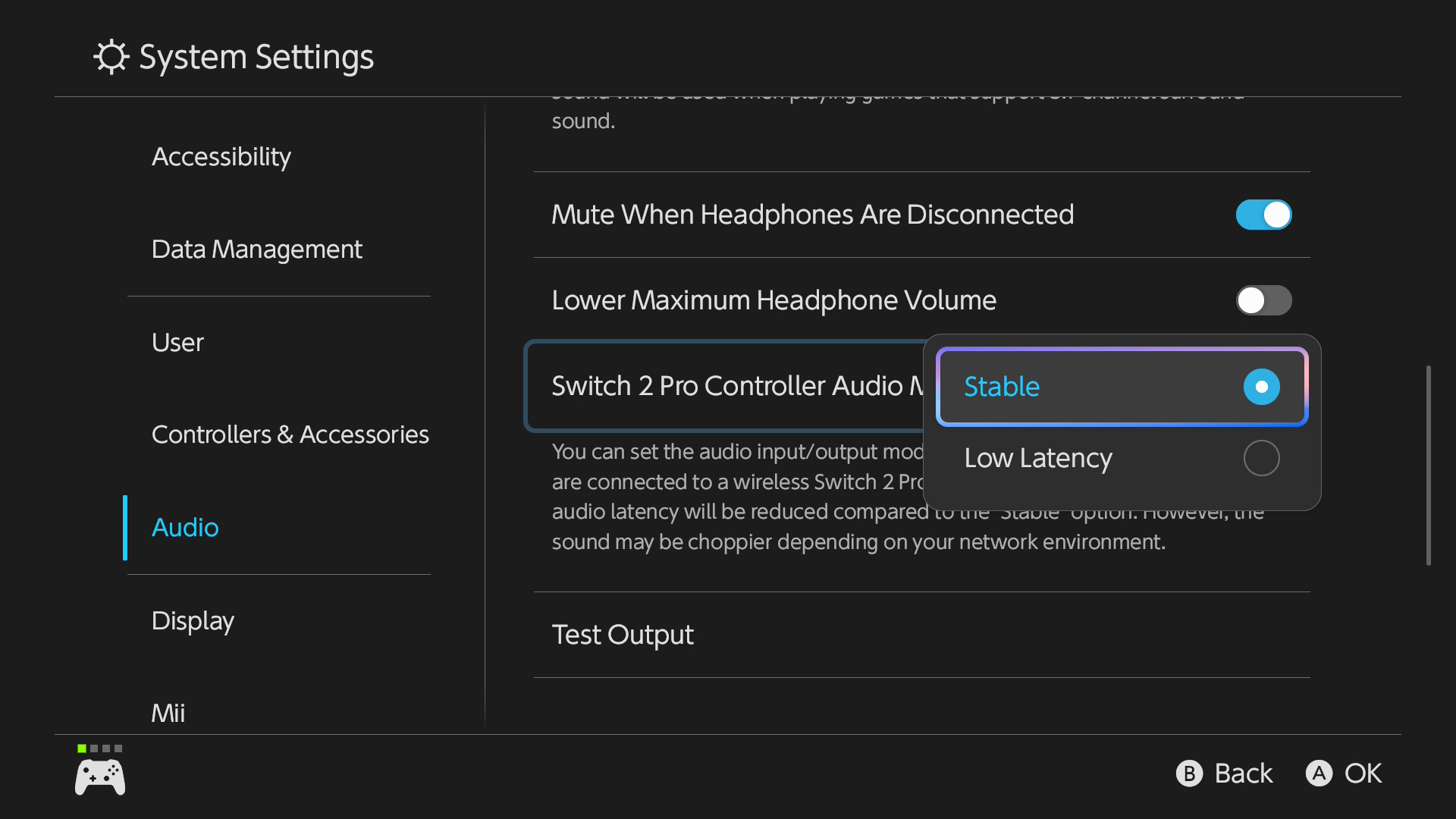More audio improvements have been made to the Nintendo Switch 2 Pro Controller. A new “Low Latency” option can be selected, which may be preferable to “Stable”. However, the connection may be more subject to interference in some wireless environments.